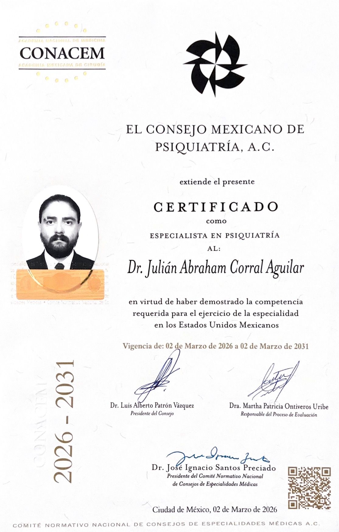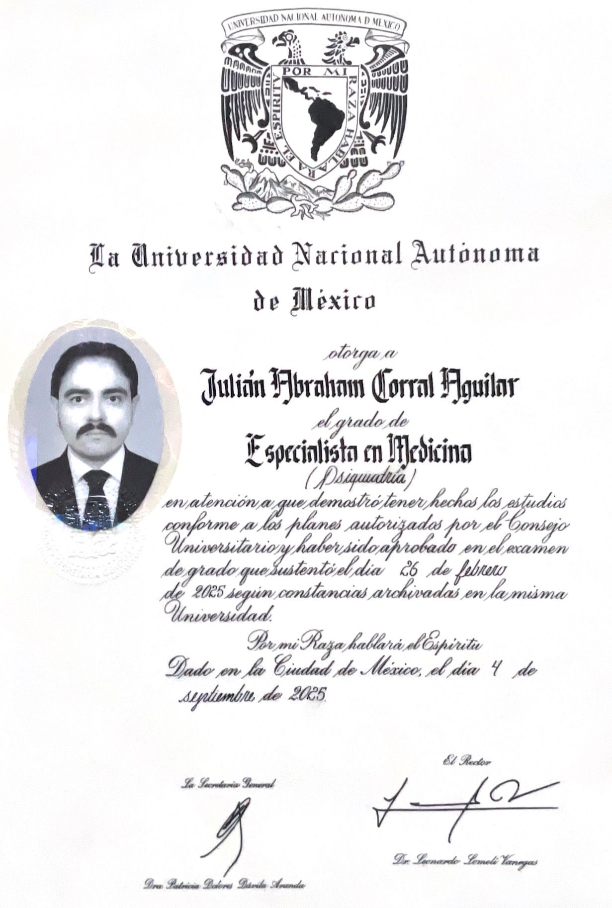 Médico Psiquiatra por la UNAM con maestría en Psicoterapia Cognitivo Conductual. Lo que más me motiva es el contacto clínico y la posibilidad de ayudar a través de un trato cercano. En mi consulta, empatizo y escucho a fondo para diseñar un manejo en conjunto que respete las necesidades de cada persona. Soy docente de Maestría con materia en bases neurofisiológicas de la TCC y miembro activo del Consejo Mexicano de Psiquiatría, comprometido con una práctica ética y profundamente humana.