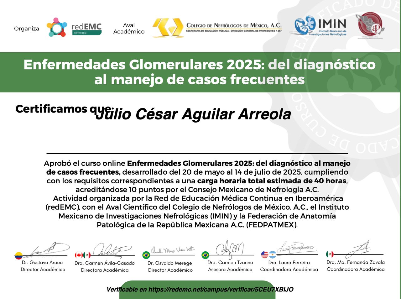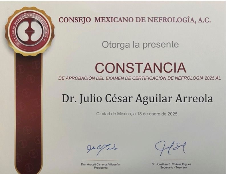Estoy certificado por el Consejo Mexicano de Nefrología y soy miembro activo de la International Society of Nephrology (ISN), la American Society of Nephrology (ASN) y la Sociedad Latinoamericana de Nefrología e Hipertensión (SLAHN).