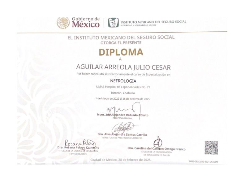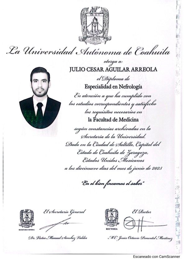 Soy médico especialista en Nefrología, con formación en la Universidad Autónoma de Ciudad Juárez, donde cursé la carrera de Medico Cirujano, realicé dos años de Medicina Interna el IMSS (HGZ 6, Ciudad Juárez). Posteriormente, completé la especialidad en Nefrología en la UNIDAD MEDICA DE ALTA ESPECIALIDAD No. 71 del IMSS en Torreón, Coahuila, avalado por la Universidad Autónoma de Coahuila.