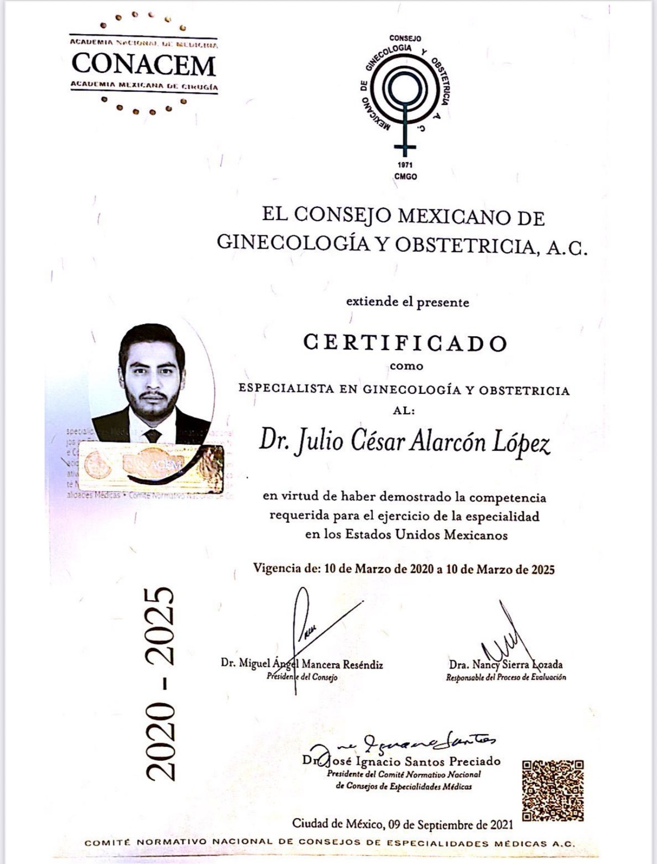 Soy el Dr. Julio César Alarcón López, ginecólogo y obstetra egresado de la Universidad La Salle, con especialidad avalada por la UNAM y certificación del Consejo Mexicano de Ginecología y Obstetricia.