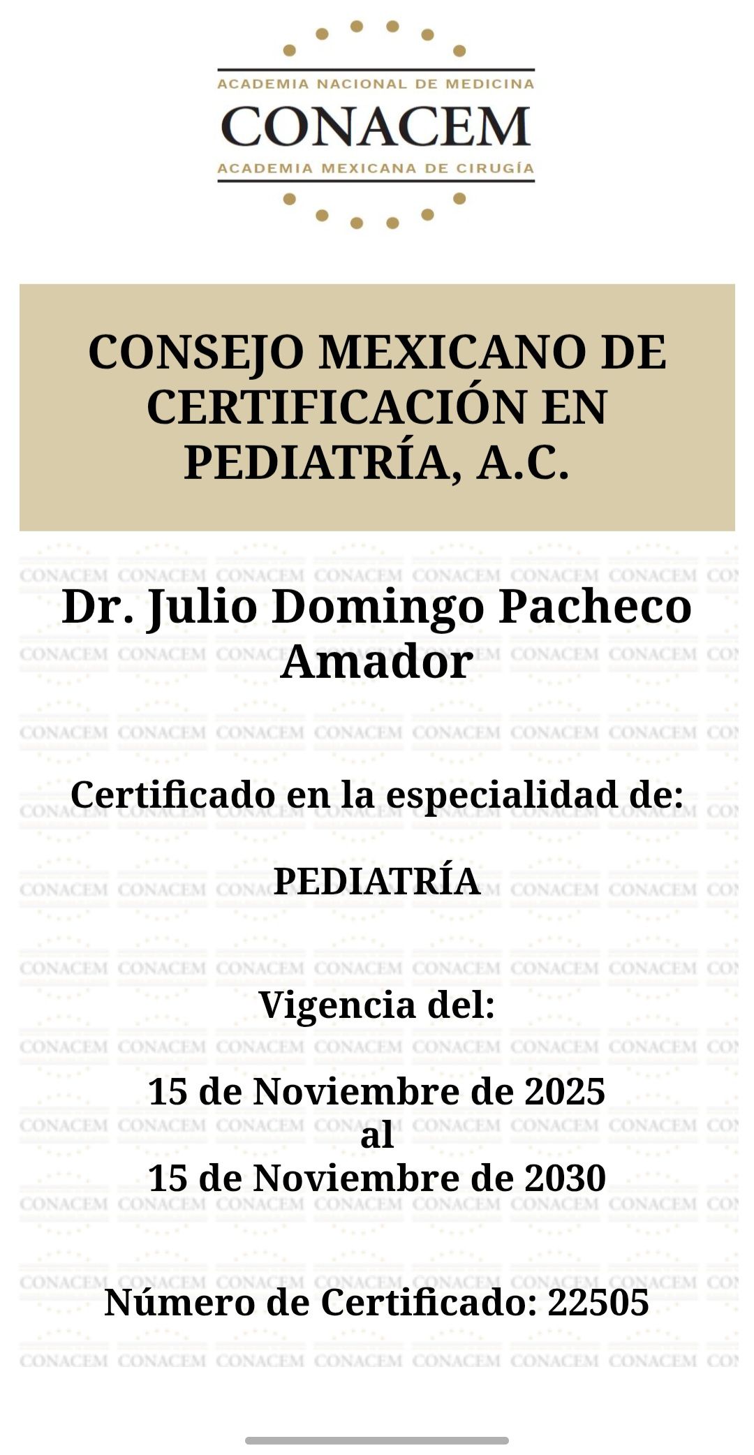 Soy el Dr. Julio Domingo Pacheco Amador, Médico Pediatra certificado por el Consejo Mexicano de Pediatria, egresado de la Universad Autonoma de Queretaro y formado en el Hospital de Especialidades del Niño y la Mujer de Querétaro. Mi práctica se ha construido sobre dos pilares: la medicina basada en evidencia y el acompañamiento humano y empático a cada familia.