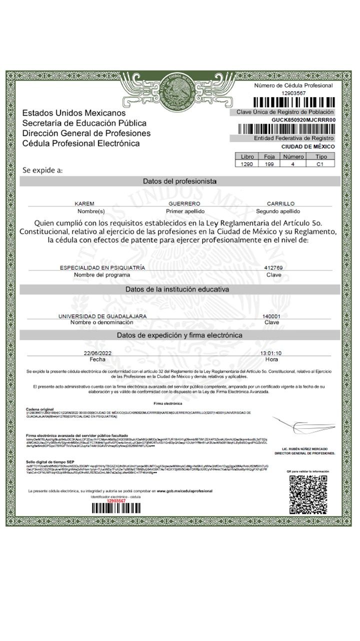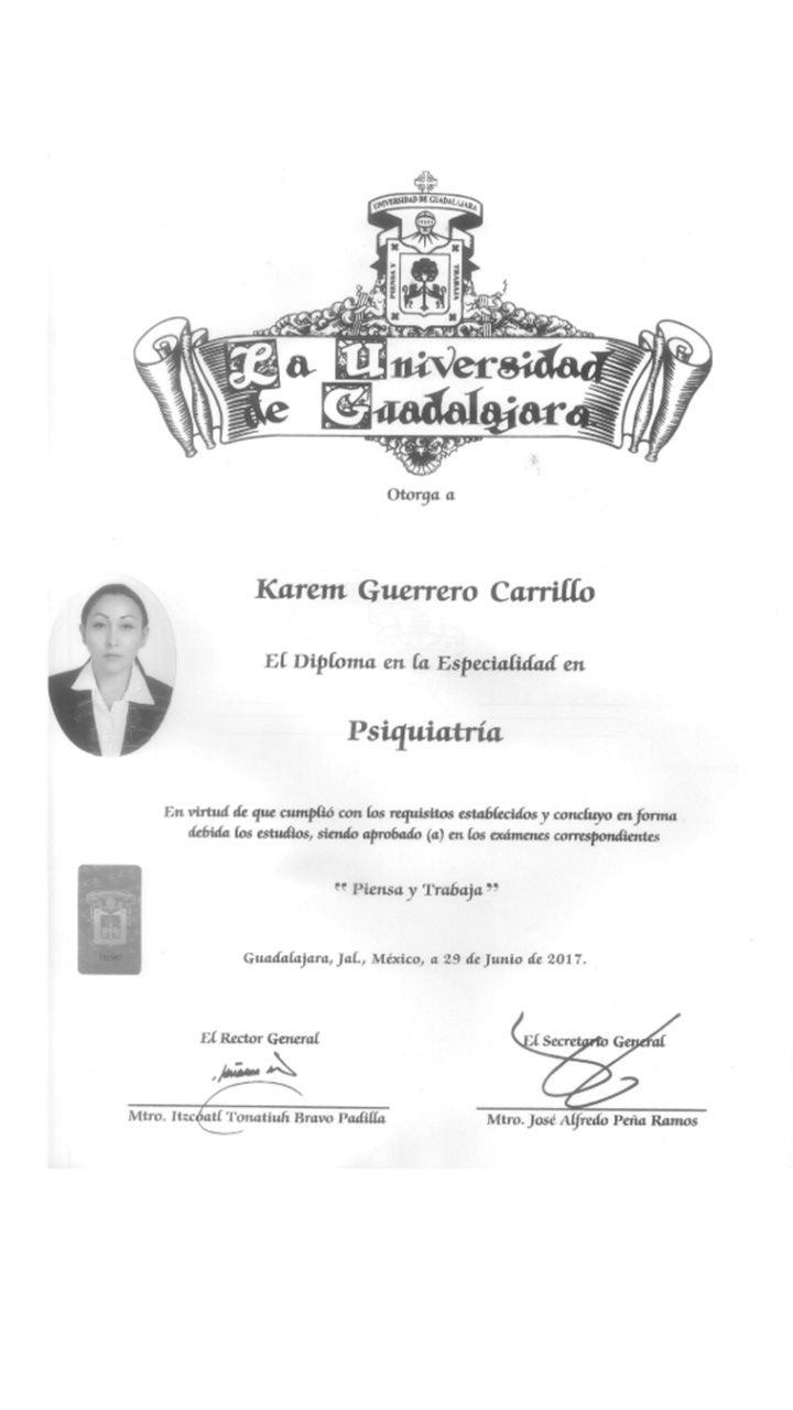 Soy Especialista en Psiquiatría por el Instituto Jalisciense de Salud Mental y la Universidad de Guadalajara (2013-2017), y Médico Cirujano Partero por la Universidad de Guadalajara.