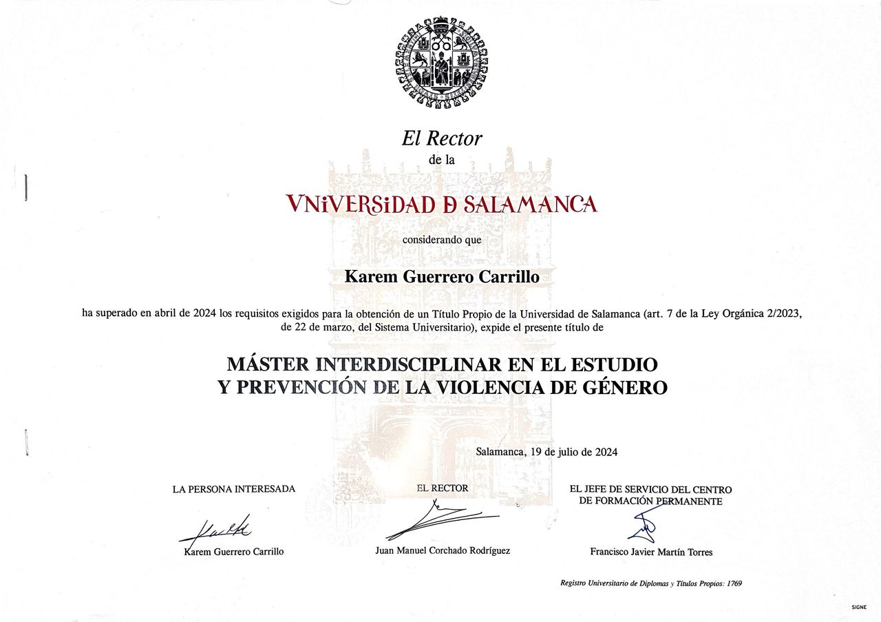 Tengo una Maestría en Estudio y Prevención de la Violencia de Género por la Universidad de Salamanca, España.