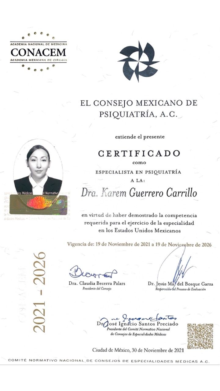 Estoy Certificada por el Consejo Mexicano de Psiquiatría (vigencia 2021-2026)