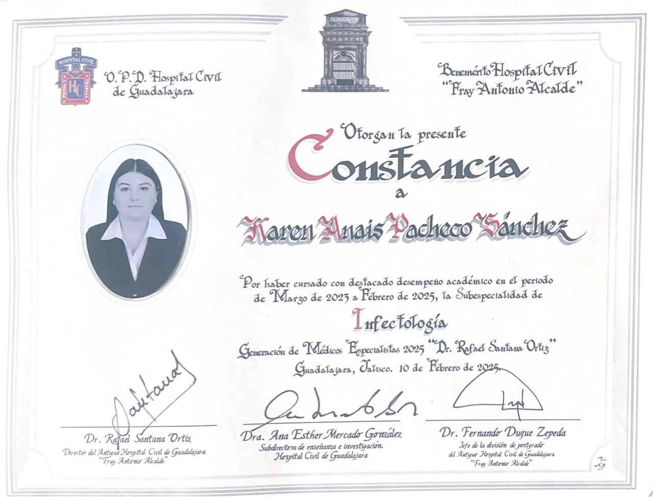 Médico infectóloga graduada de la Univesidad de Guadalajara con formación en el Antiguo Hospital Civil de Guadalajara "Fray Antonio Alcalde".
