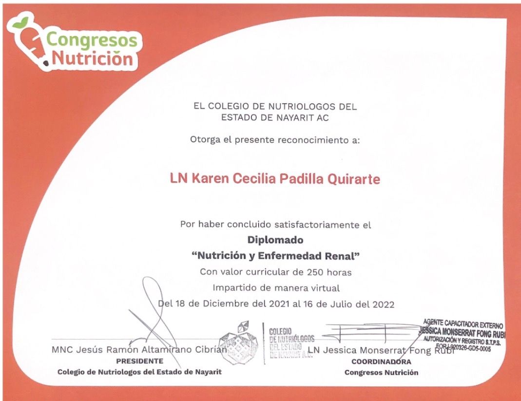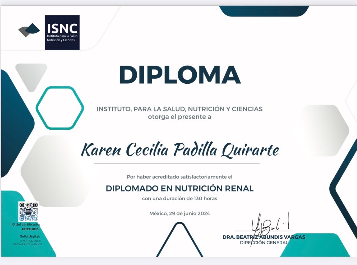 Hola soy la Nutrióloga Karen Padilla, especializada en área renal, cuento con 3 diplomados en nutrición renal, 1 en diabetes y cursando otro en esta área. Siempre estoy actualizándome tomando cursos para ofrecer el mejor tratamiento a la vanguardia para mis pacientes. Estoy ubicada en la Unidad de Salud Renal en Hermosillo, Sonora será un placer atenderte