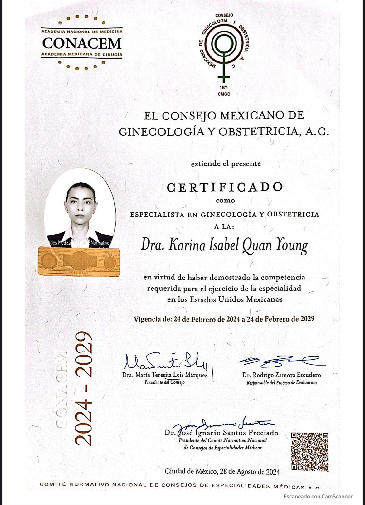 Actualmente me encuentro certificada por el Consejo Mexicano de Ginecología y Obstetricia. Además de contar con actualización médica continua mediante cursos y congresos.