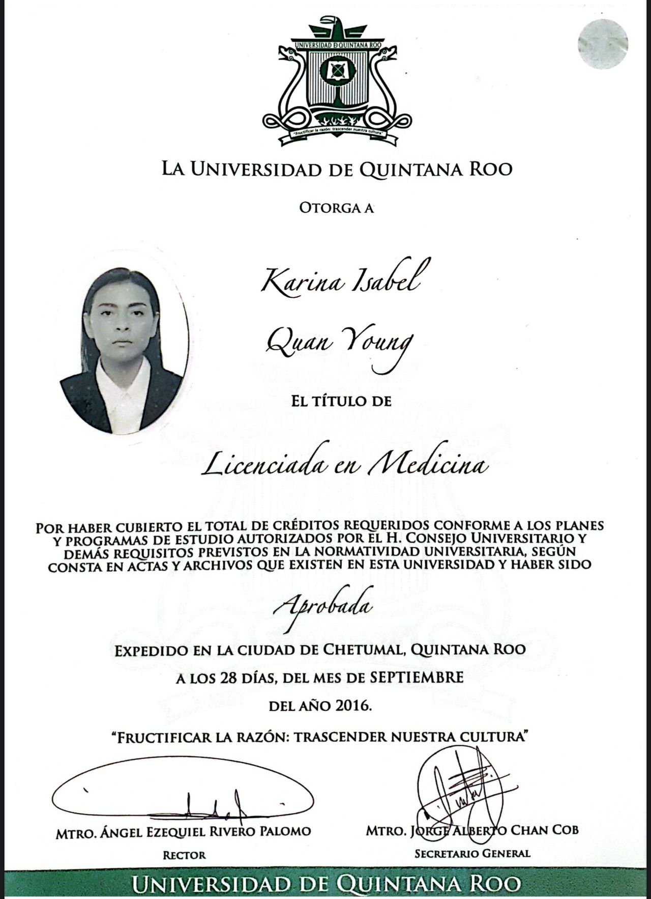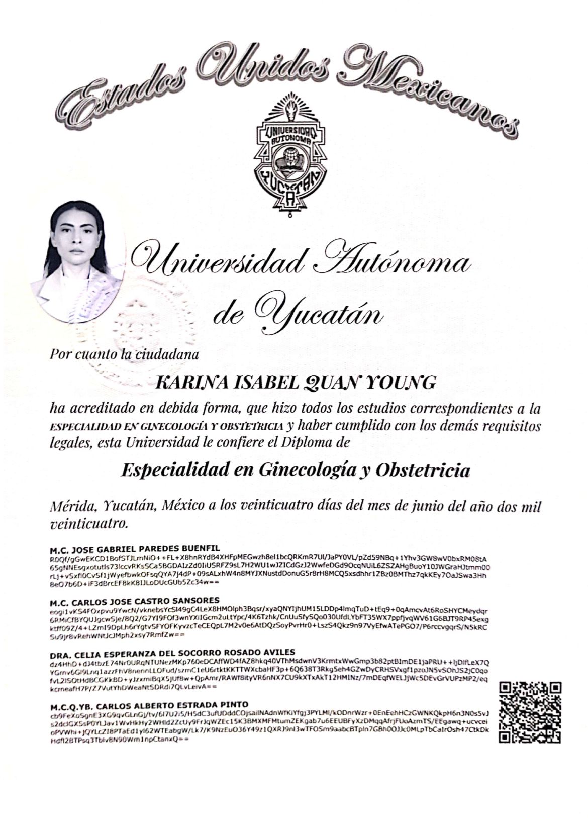 ¡Hola! Soy la Dra. Karina Isabel Quan Young, especialista en Ginecología y Obstetricia por la UADY, formada en el Hospital T1 IMSS Mérida, uno de los hospitales más importantes en la formación de la especialidad.
