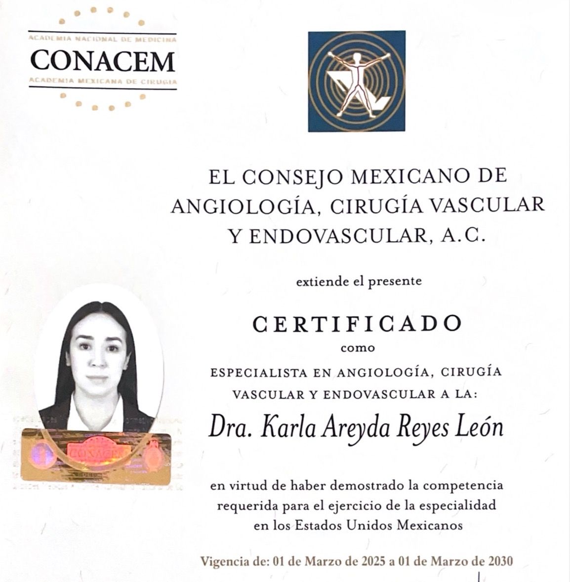 Certificada por el Consejo Mexicano de Angiología, Cirugía Vascular y Endovascular.