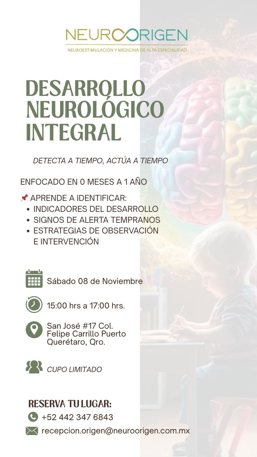 El 8 de noviembre en Neuro Origen realizaremos el Taller de Desarrollo Neurológico Integral, creado para familias que desean acompañar de forma consciente el crecimiento de sus bebés durante el primer año de vida.