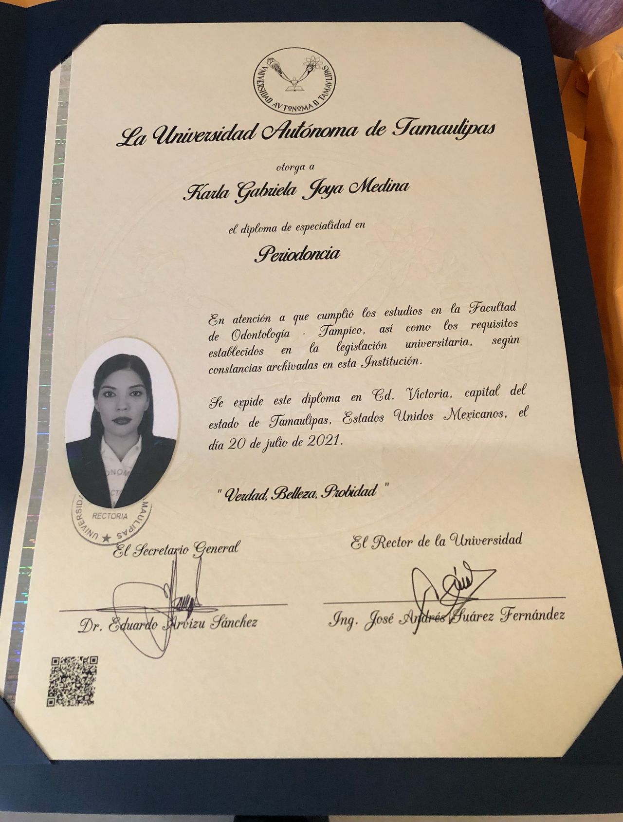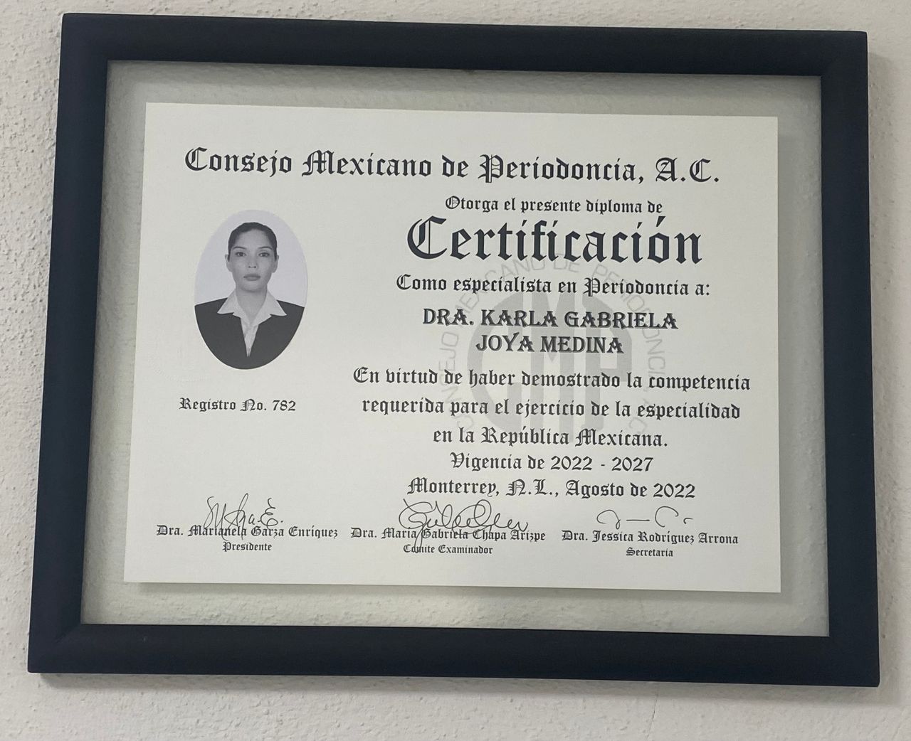 Soy la Dra. Karla Gabriela Joya Medina, especialista en Periodoncia e Implantología en Bahía de Banderas. Con formación en la Universidad de Guadalajara y la Universidad Autónoma de Tamaulipas, y certificación del Consejo Mexicano de Periodoncia (No. 782), me dedico a restaurar la salud, la función y la estética de sus encías y dientes mediante tratamientos avanzados.