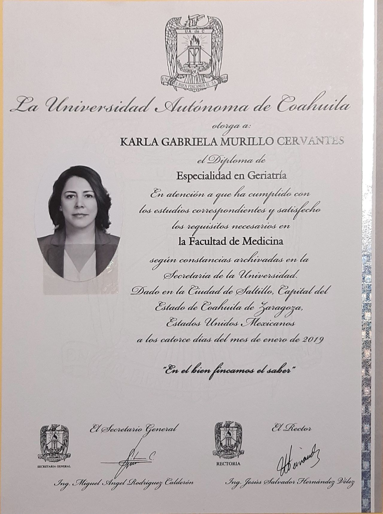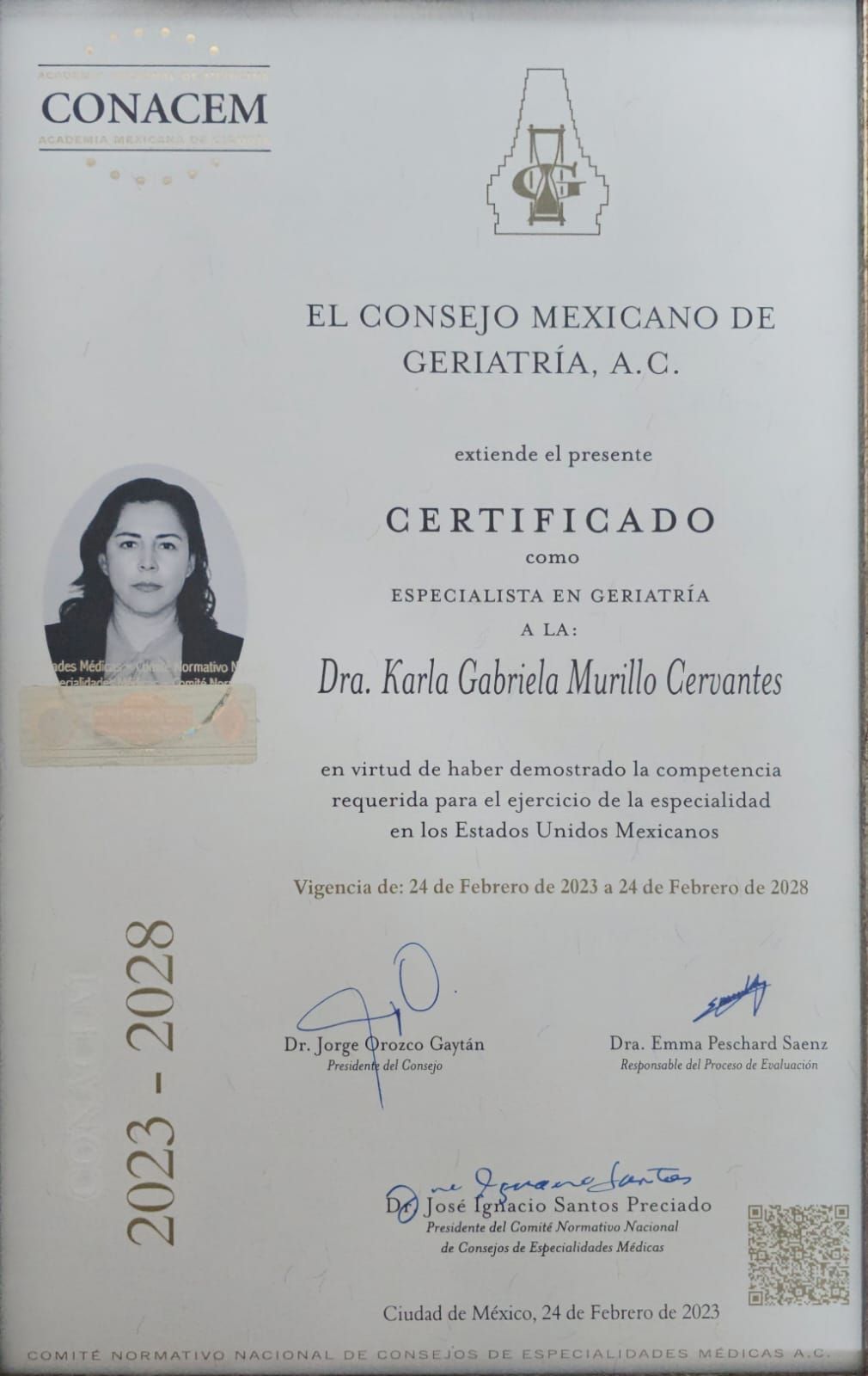 Soy la Dra. Karla Gabriela Murillo Cervantes, especializada en Geriatría y radico en Querétaro. Mi enfoque principal es la atención médica de adultos mayores, con detección, tratamiento y seguimiento de los padecimientos propios de esta edad, con el objetivo de mejorar su calidad de vida y la de su familia.