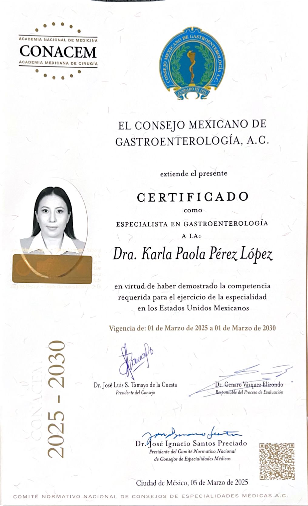 Soy médico especialista en Medicina Interna, cuento con subespecialidad en Gastroenterología, ambas por la UNAM, me encuentro certificada por el Consejo Mexicano de Medicina Interna y el Consejo Mexicano de Gastroenterología, alta especialidad en Endoscopia Gastrointestinal.