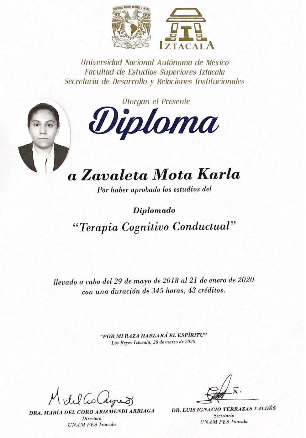 Estudié la especialidad en promoción de la salud y prevención del comportamiento adictivo con enfoque Cognitivo Conductual (UNAM, titulación en trámite) y la Maestría en Terapia Familiar con enfoque sistémico (UNAM, en curso).