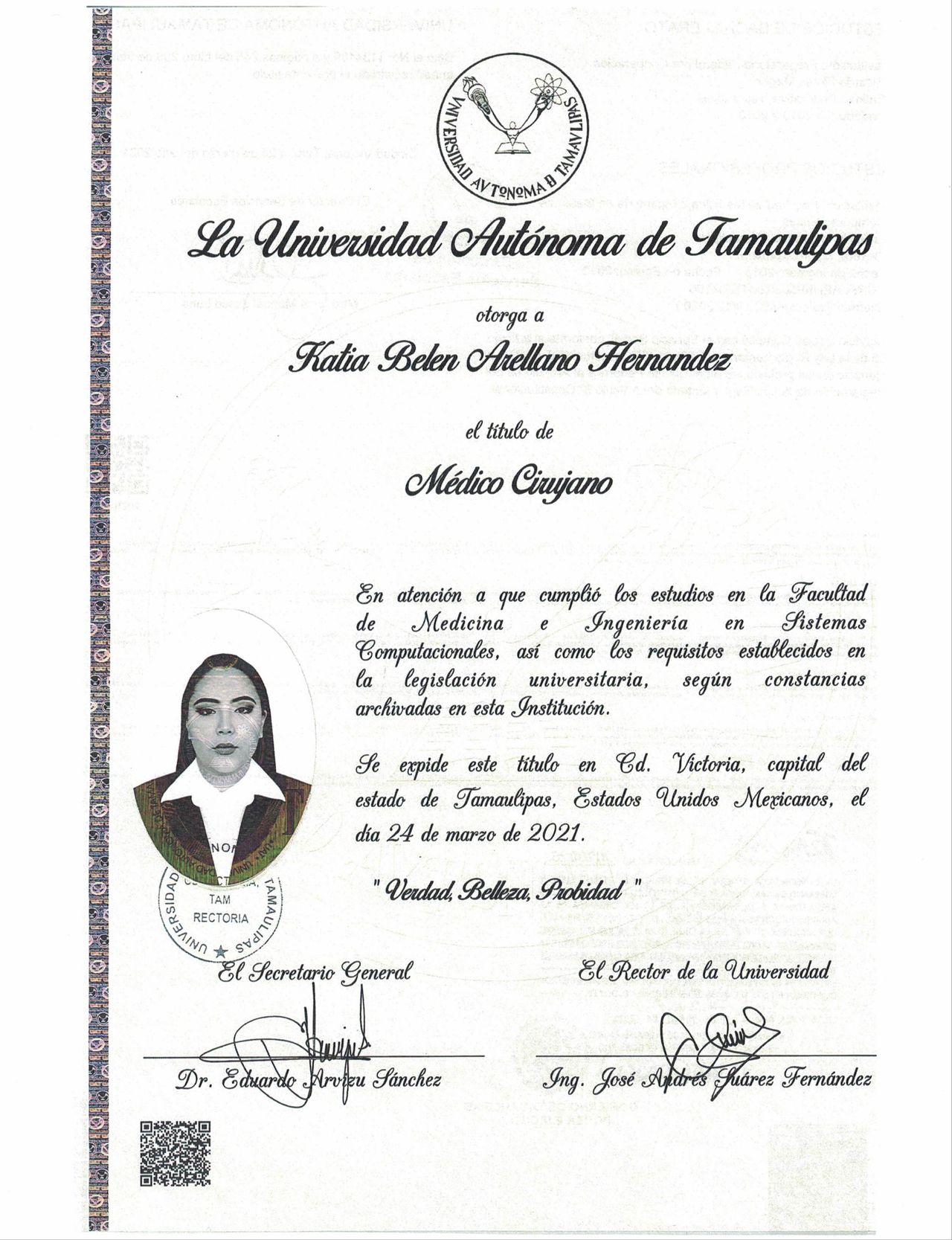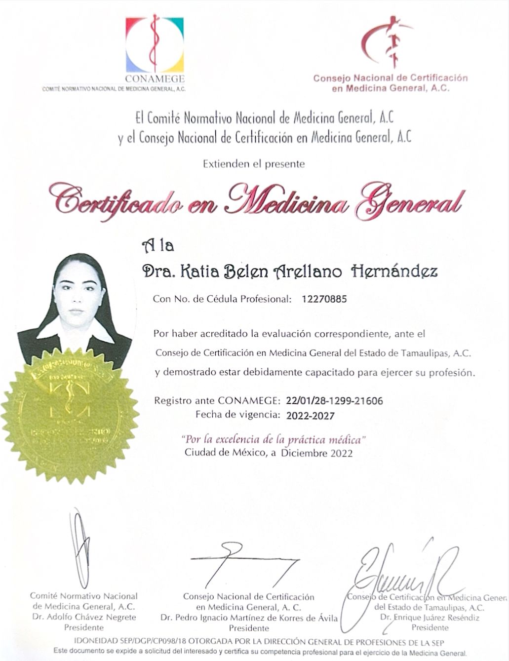 Soy Médico General, certificada por el Colegio de Médicos Generales de Tamaulipas y orgullosamente egresada de la UAT – Campus Matamoros.
