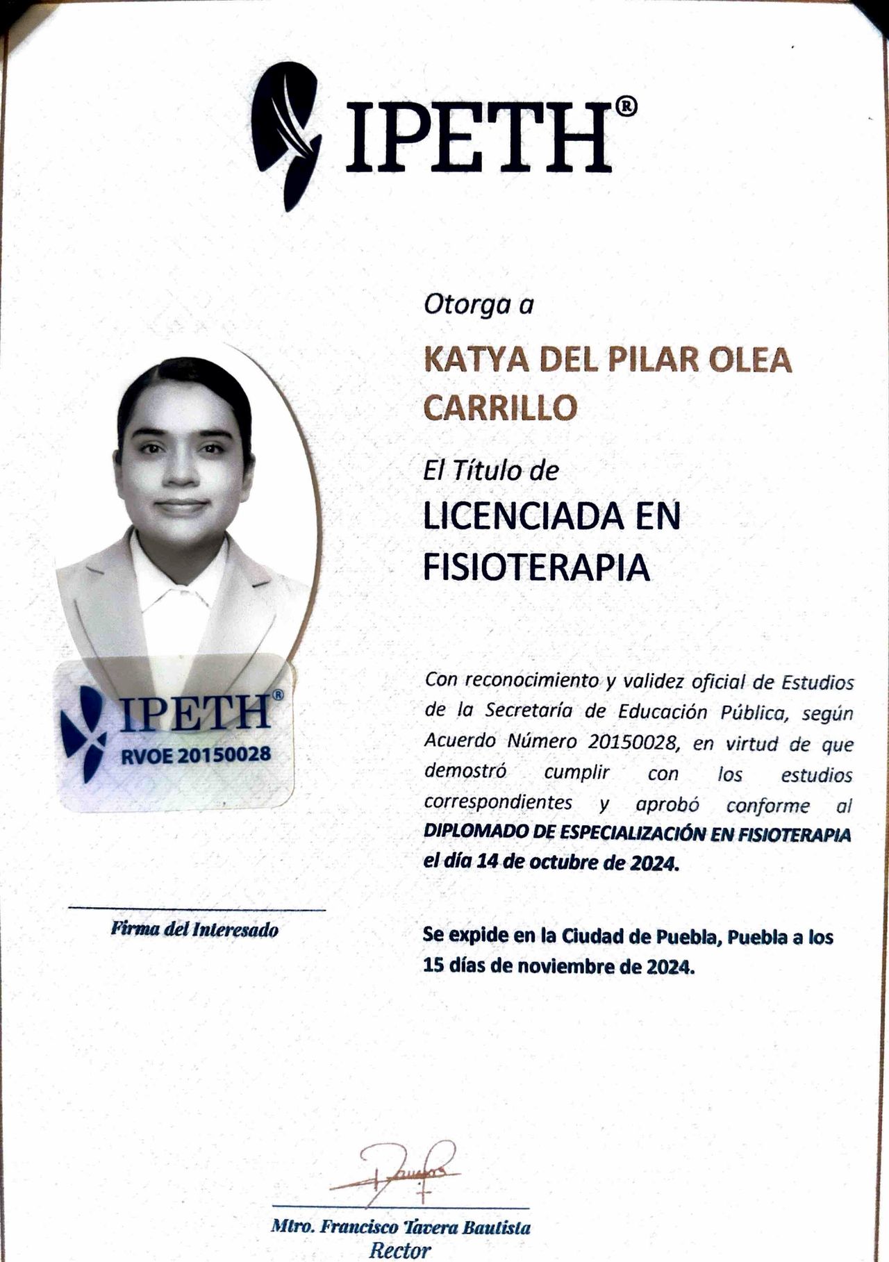 ¡Hola! Soy la Lic. Katya Olea. Mi principal objetivo como fisioterapeuta es ayudarte a recuperar tu movimiento para que puedas volver a disfrutar de tu vida sin dolor.
