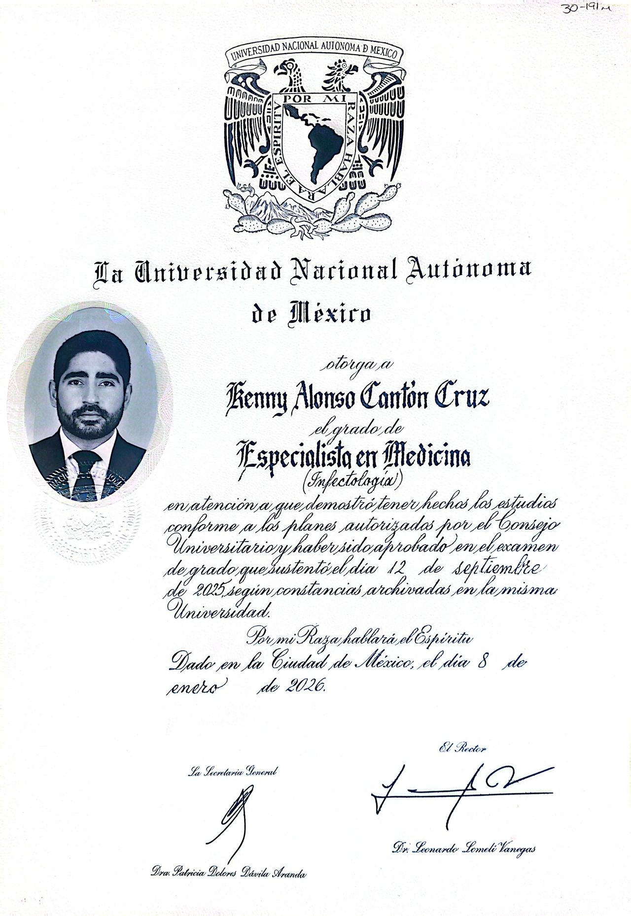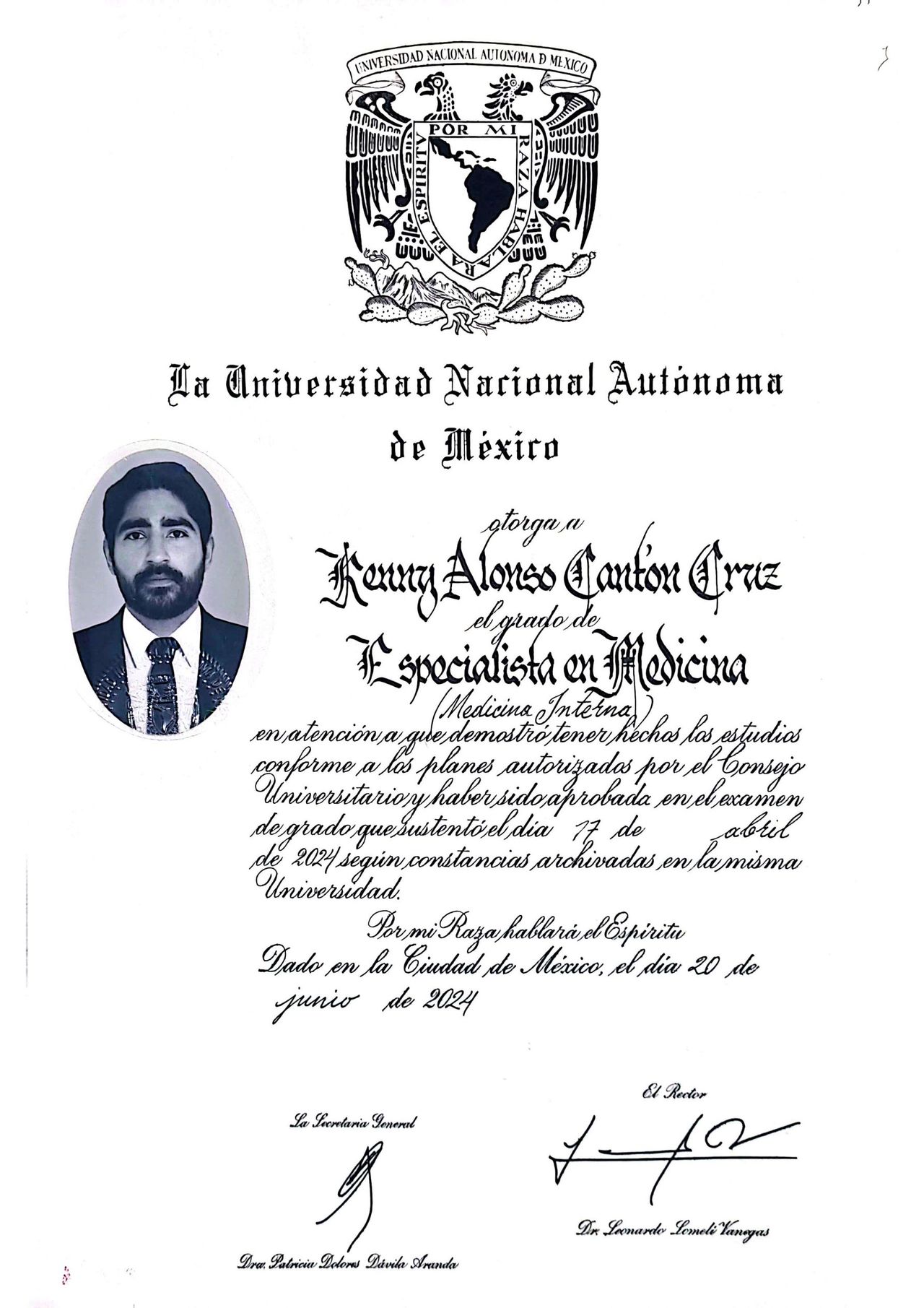 Soy el Dr. Kenny Alonso Cantón Cruz, un médico dedicado y con una sólida formación en Medicina Interna. Mi trayectoria académica comenzó en la Universidad Autónoma de Yucatán, y me especialicé en el Hospital Regional de Alta Especialidad de la Península de Yucatán, con el aval académico de la Universidad Nacional Autónoma de México. Cuento con la certificación del Consejo Mexicano de Medicina Interna, A.C., lo que valida mi compromiso con la excelencia profesional.