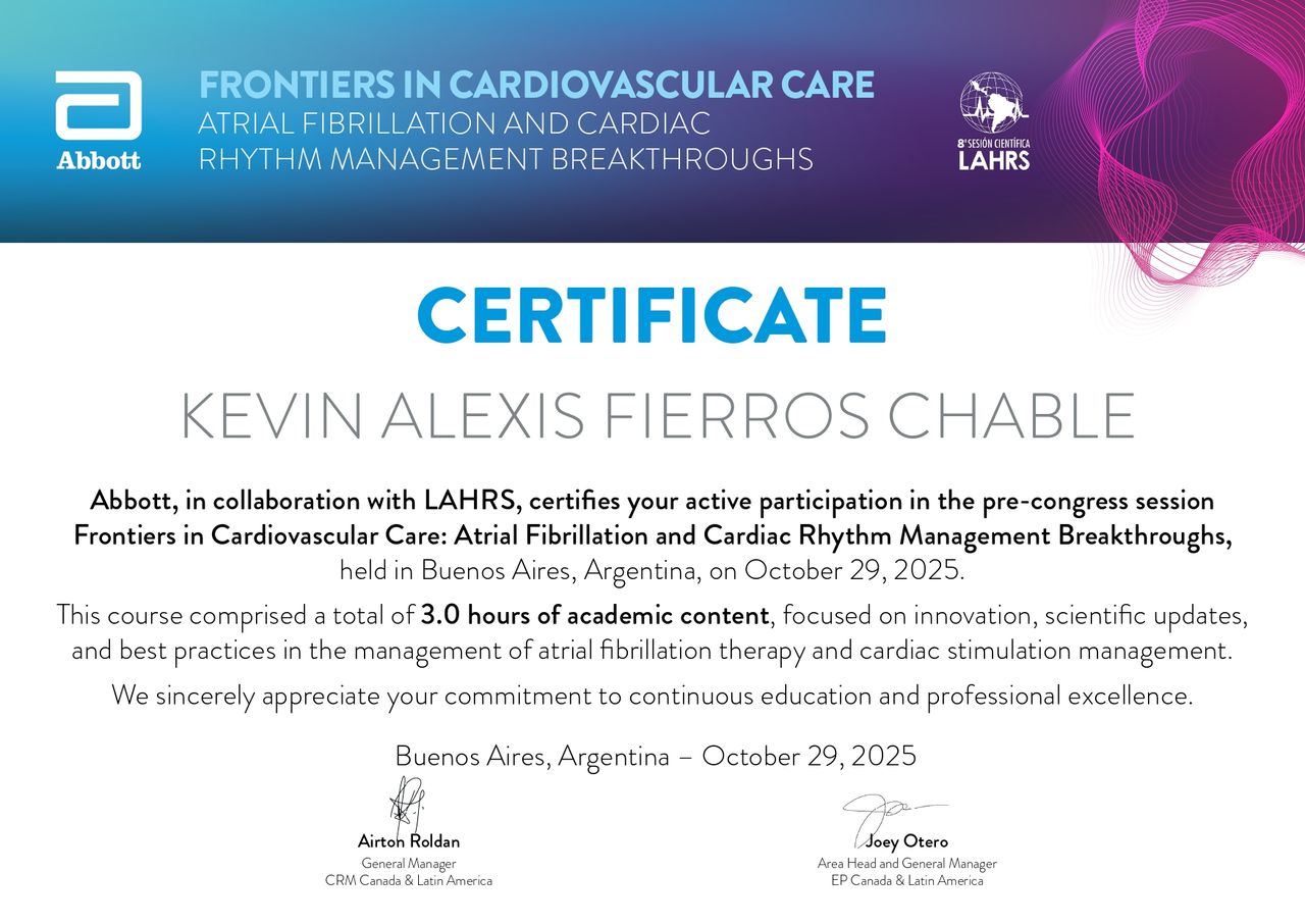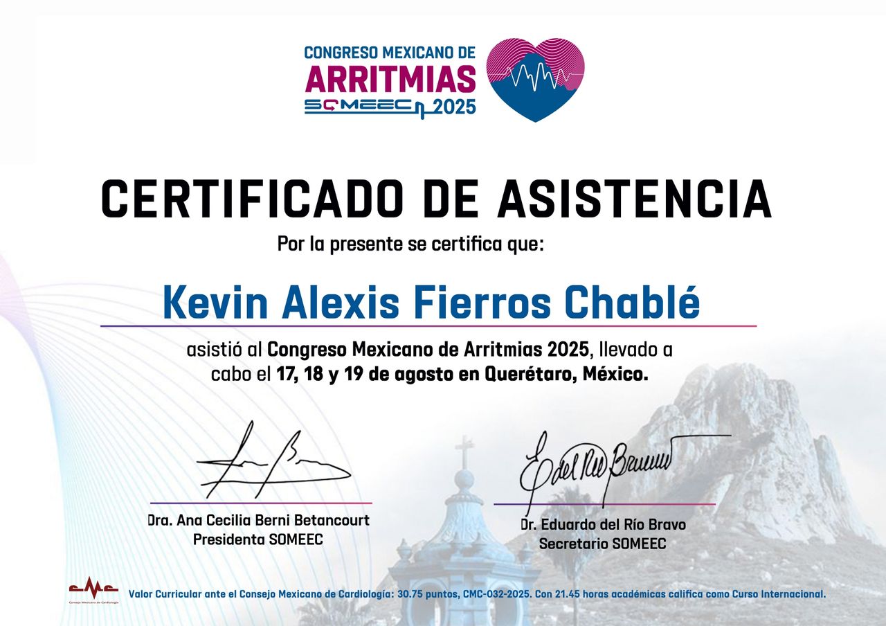 Soy cardiólogo clínico con alta especialidad en electrofisiología cardíaca, egresado de la Universidad Nacional Autónoma de México. Me he formado en centros de referencia como Centro Médico ABC, Hospital Ángeles del Pedregal y Hospital MAC, con participación académica en congresos internacionales como la European Society of Cardiology, desarrollando experiencia en el diagnóstico y tratamiento avanzado de arritmias y terapias con dispositivos cardiacos.