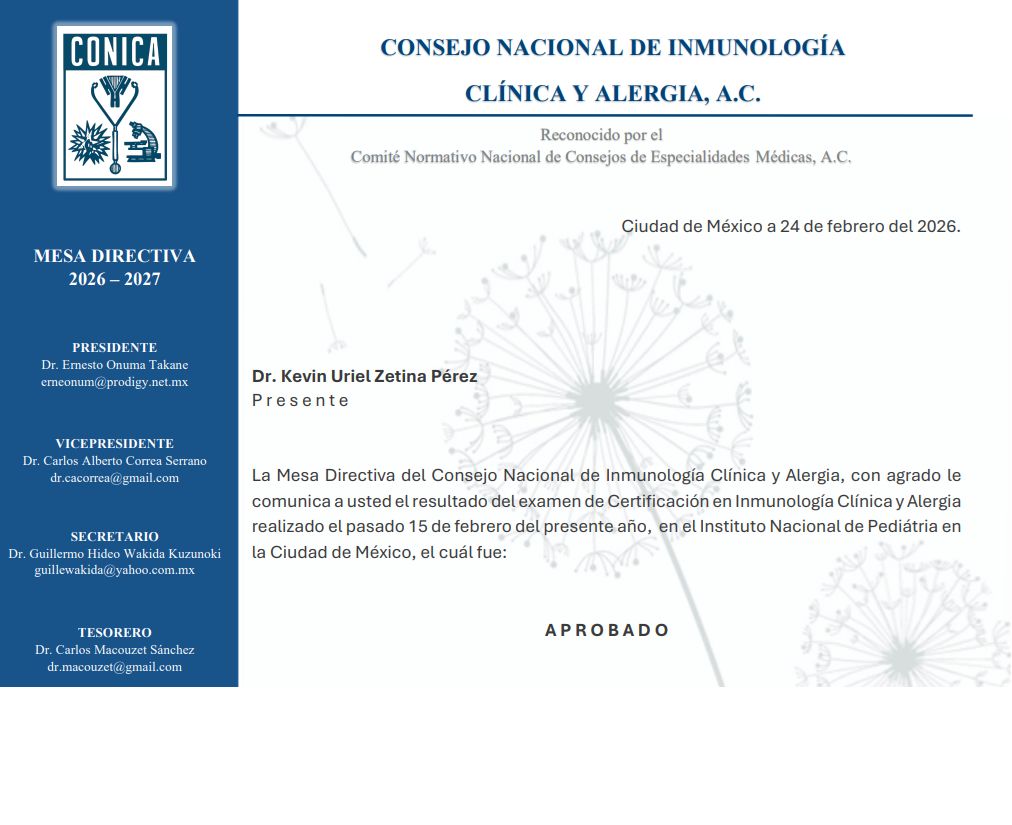 Subespecialidad en Alergia e Inmunología Clínica en la Ciudad de México, avalado por la Universidad Nacional Autónoma de México (UNAM).