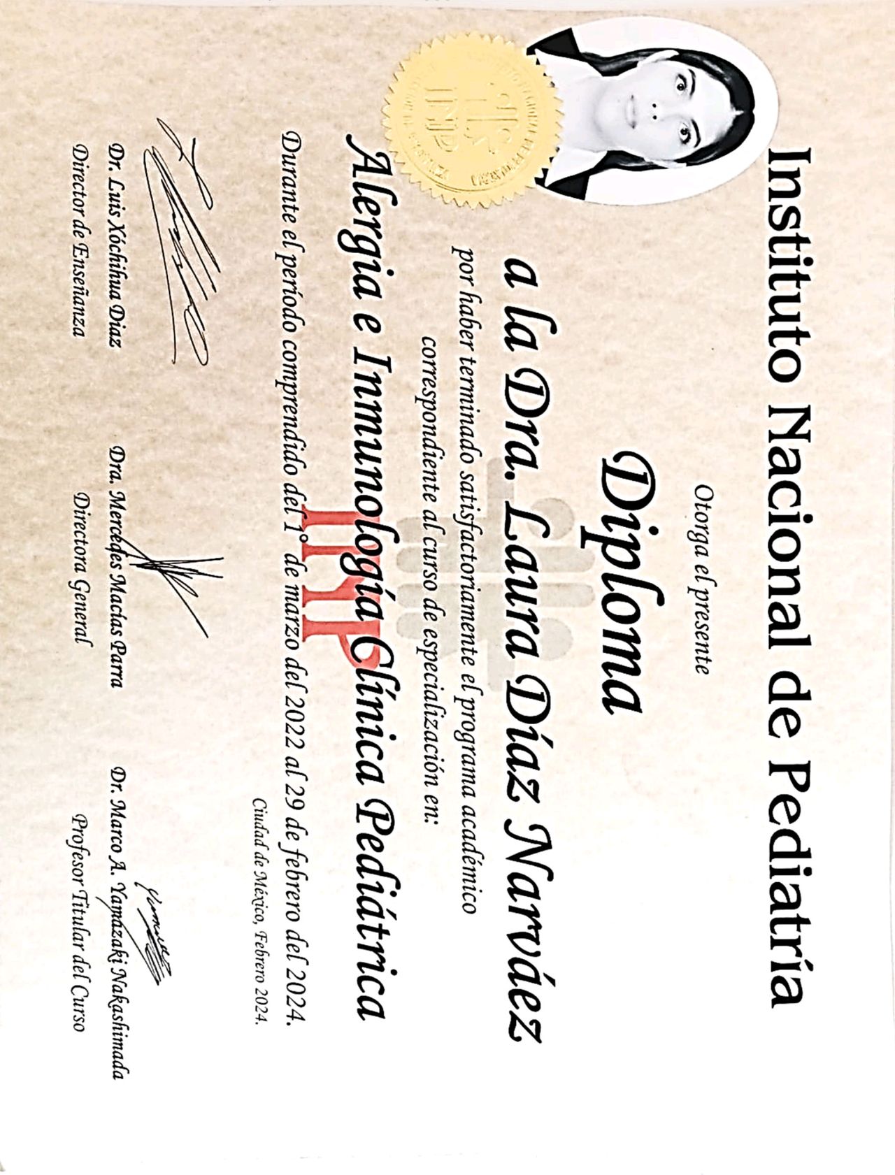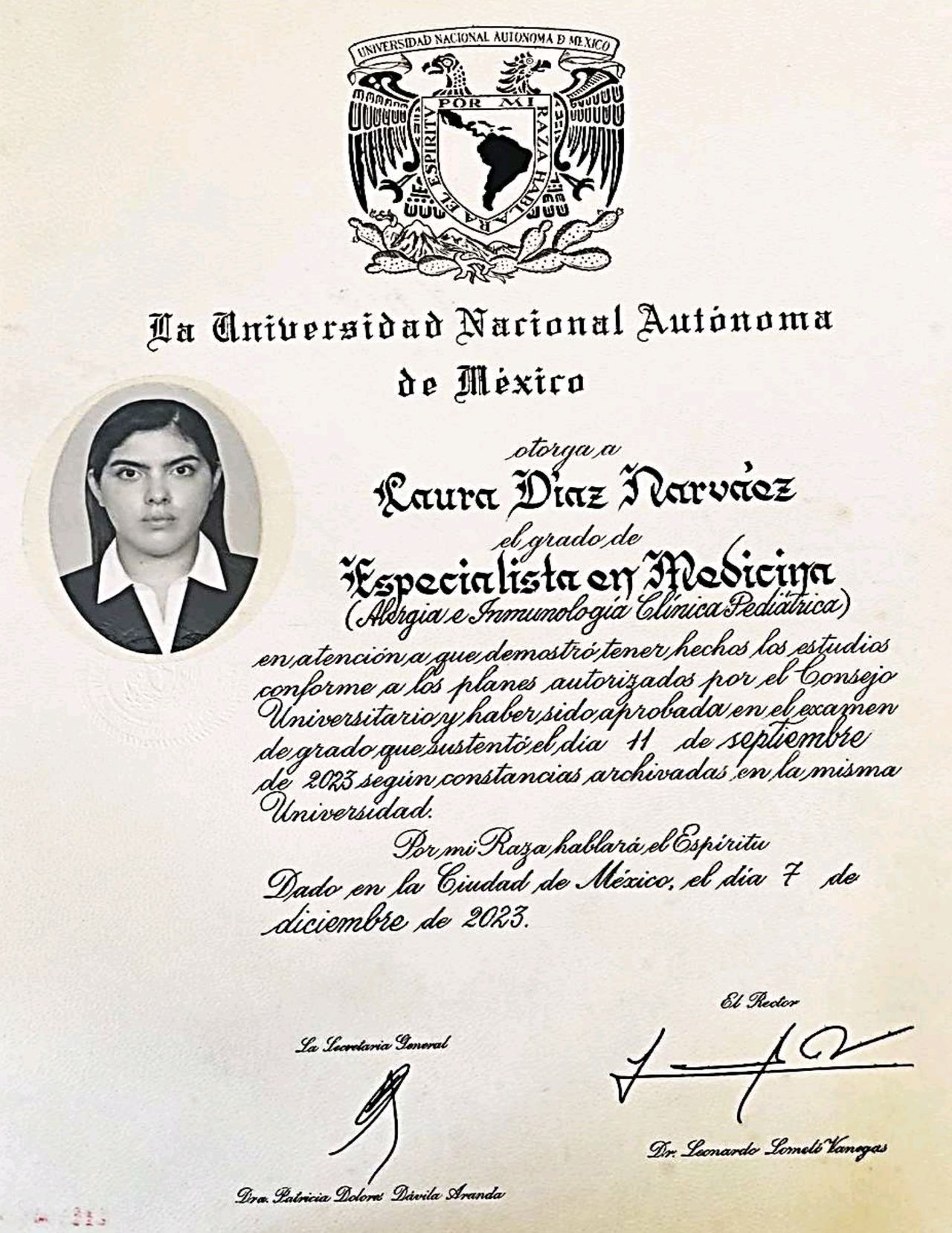 ¡Hola! Soy la Dra. Laura Díaz Narváez, especialista en Pediatría y Subespecialista en Alergia e Inmunología Clínica Pediátrica, certificada por los consejos mexicanos CONICA y CMCP. Desde el inicio de mi carrera he tenido como misión ofrecer atención integral y personalizada, con un enfoque humano y cálido que refleje la identidad y valores de mi tierra chiapaneca.