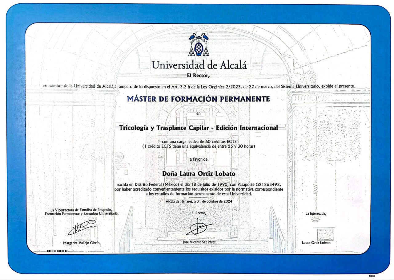 Máster en Tricología y Trasplante Capilar por la Universidad de Alcalá de Henares, España