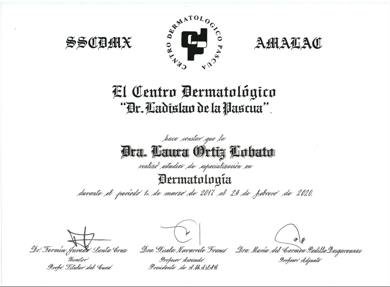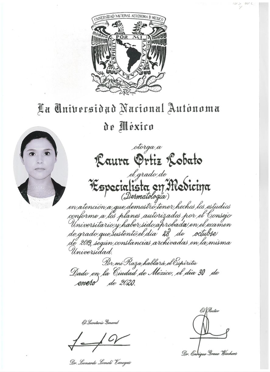 Egresada de dermatología en la CDMX del Centro Dermatológico Dr. Ladislao de la Pascua, UNAM.