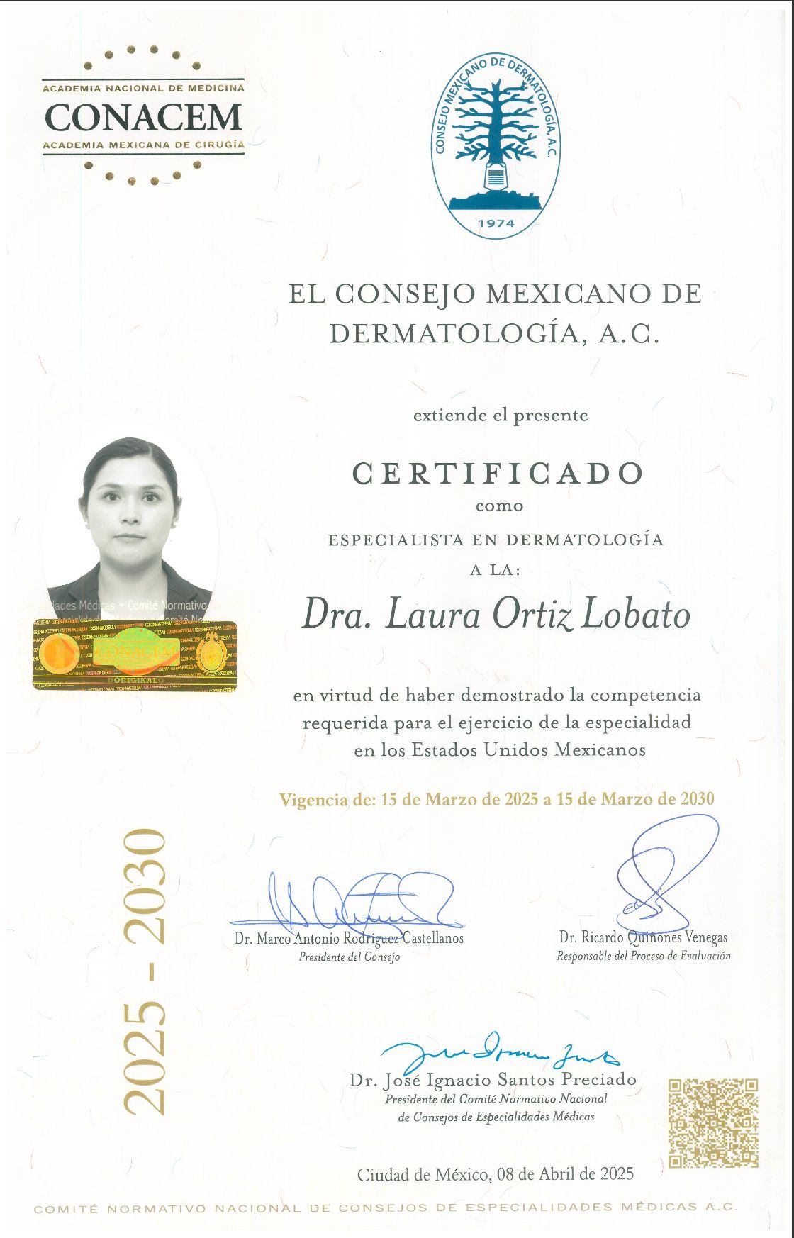 Dermatóloga certificada por el Consejo Mexicano de Dermatología
