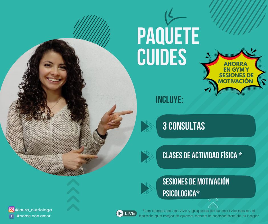 El paquete Cuides incluye: 3 consultas de nutrición, acceso gratuito a las clases virtuales en vivo y grabadas, de lunes a viernes a lo largo del día de Activación funcional y de Motivación psicológica grupales, las cuales te ayudarán a moverte desde la comodidad de tu hogar o en el lugar donde te encuentres, lograr el apego, la motivación a los cambios que desees y cumplir tus objetivos. El que adquieras el paquete te permitirá comprometerte, generar comunidad y apoyo; lo cual te permitirá tener cambios sostenibles y permanentes. Como plus, el ahorro de membresias costosas de gimnasio y de sesiones de motivación psicológica incluido en un sólo precio.