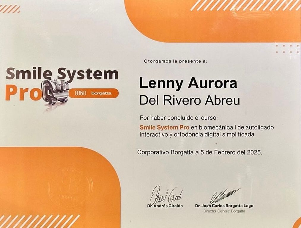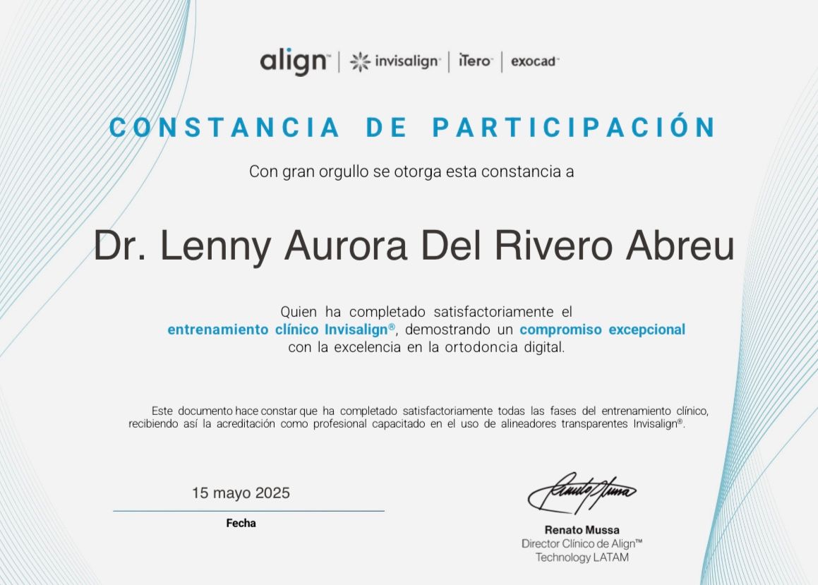 Como especialista en ortodoncia, me mantengo en constante actualización para brindar a mis pacientes tratamientos modernos. Cuento con certificación en ortodoncia invisible (Invisalign) y de brackets estéticos, sistemas de autoligado y ortodoncia convencional, eligiendo siempre la técnica más adecuada según las necesidades clínicas y estéticas de cada paciente.