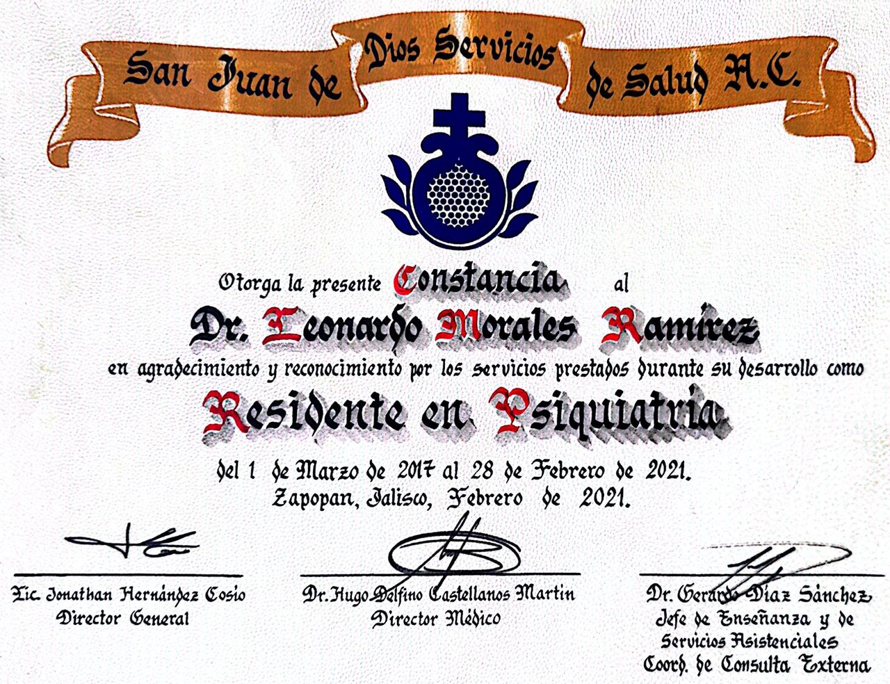 Especialidad en Psiquiatría con sede en el Hospital Psiquiátrico San Juan de Dios en el periodo 2017-2021