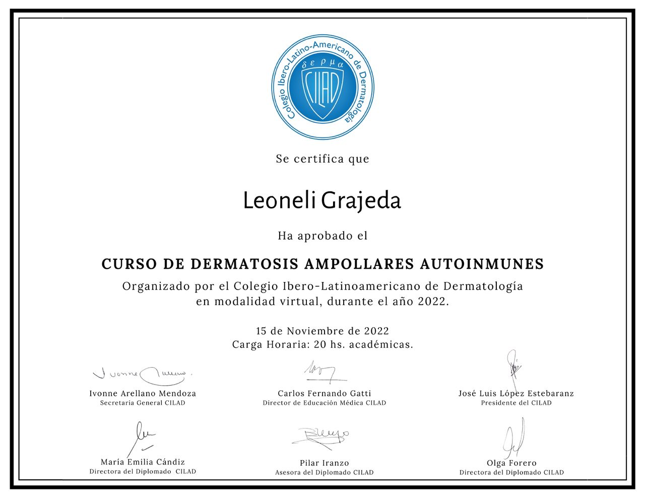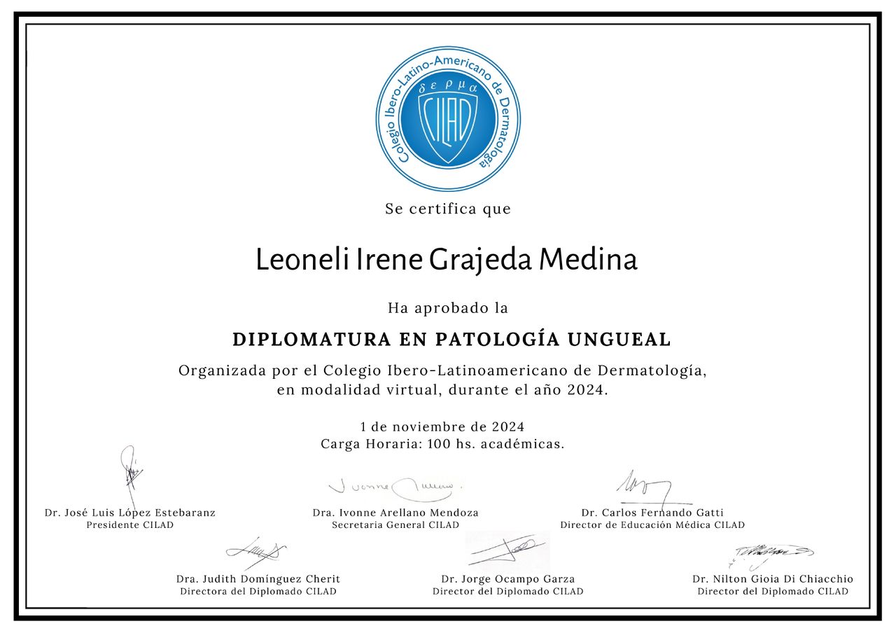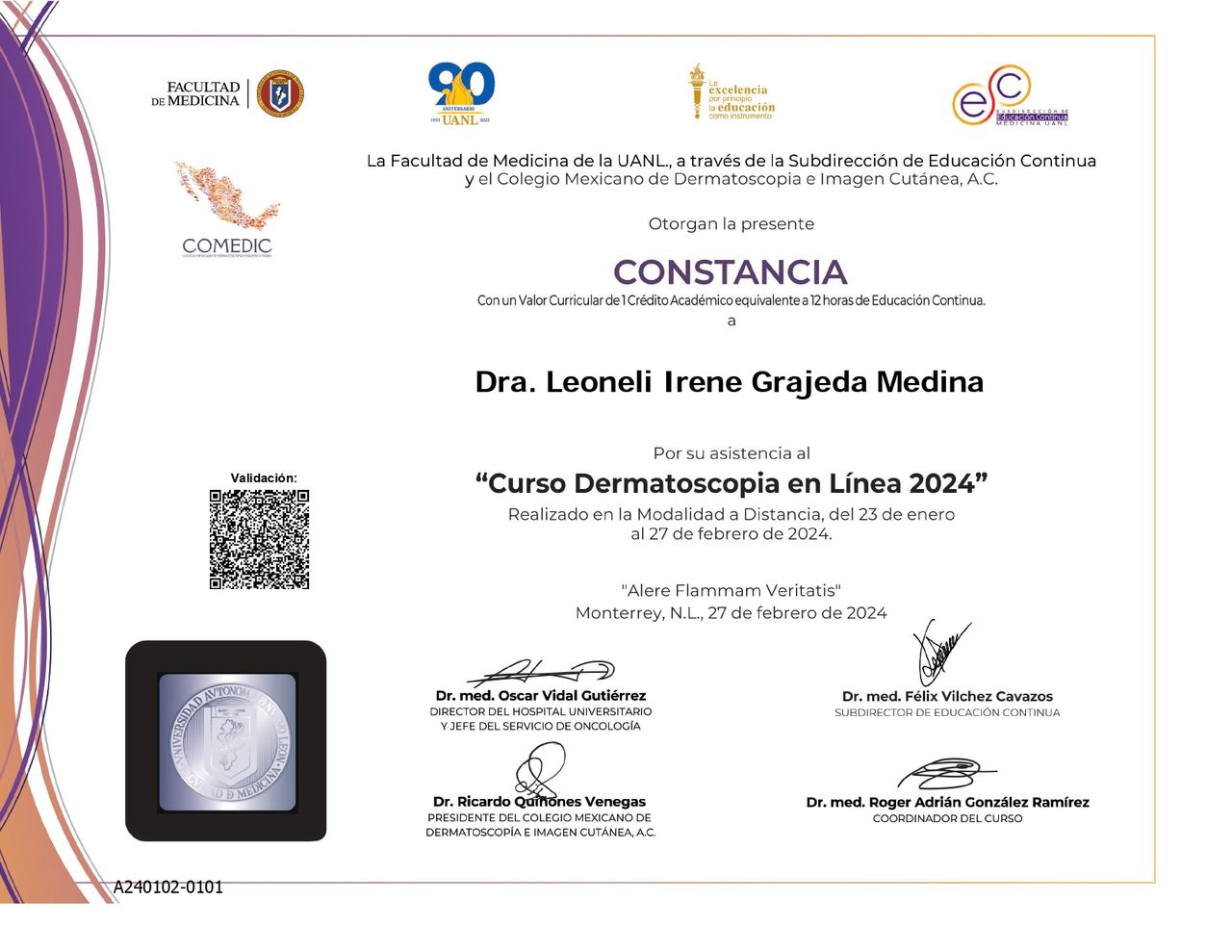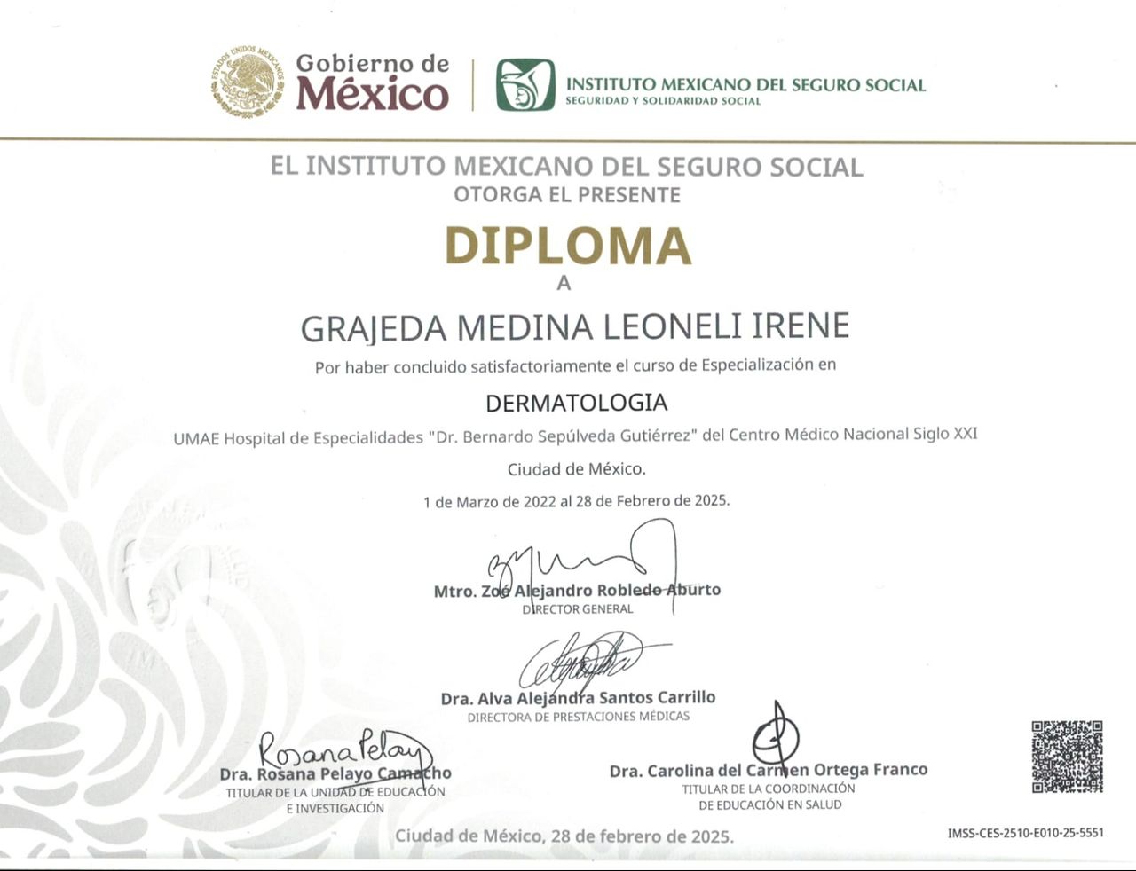 Durante mi especialización, he sido parte de diversos cursos y reuniones nacionales e internacionales, en donde afirmé mi pasión por las enfermedades de la piel, pelo y uñas.