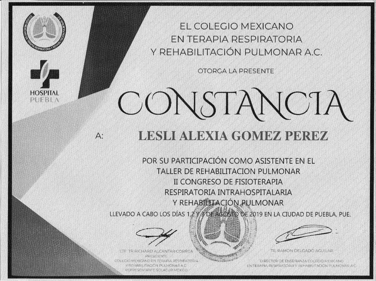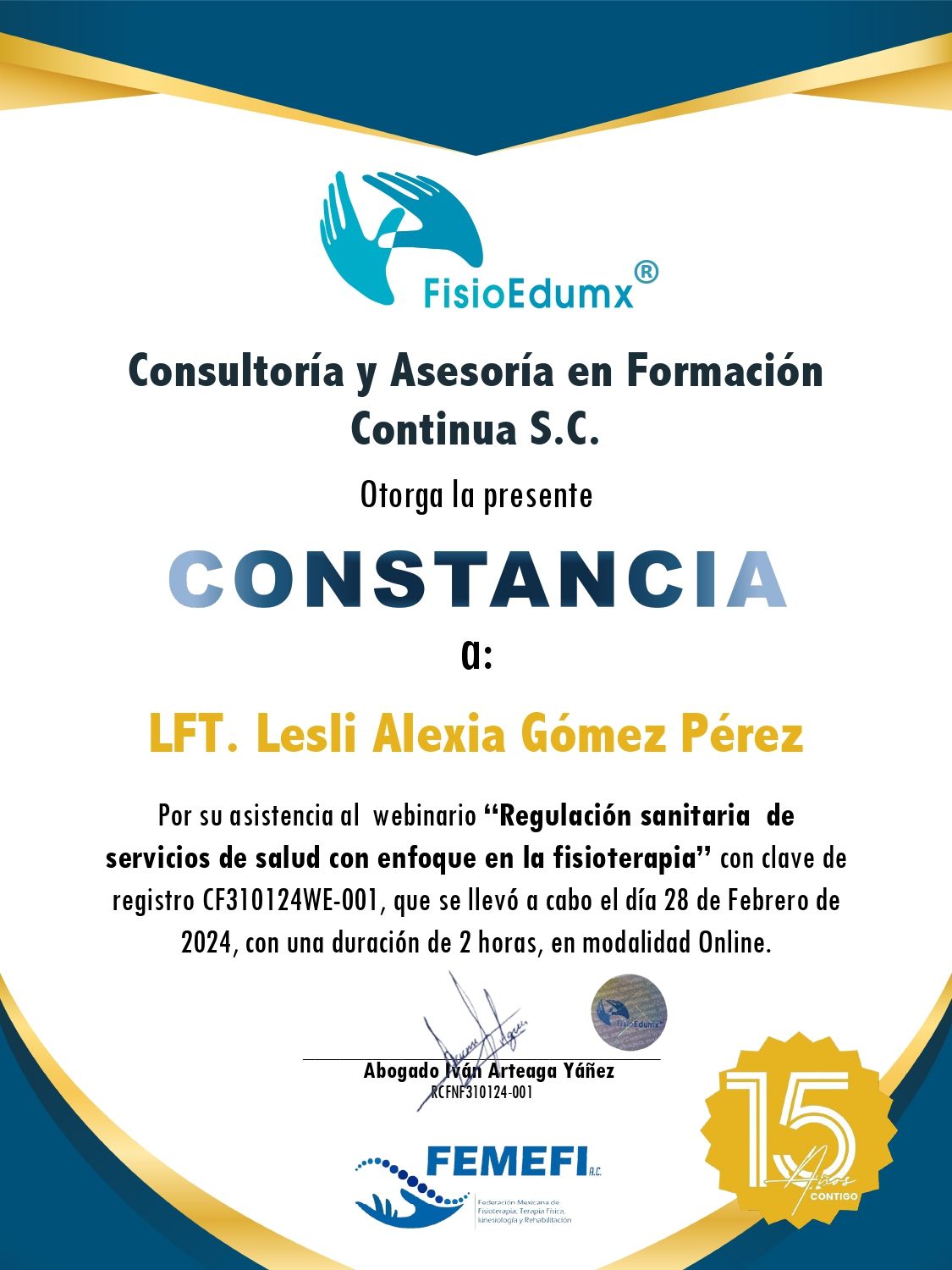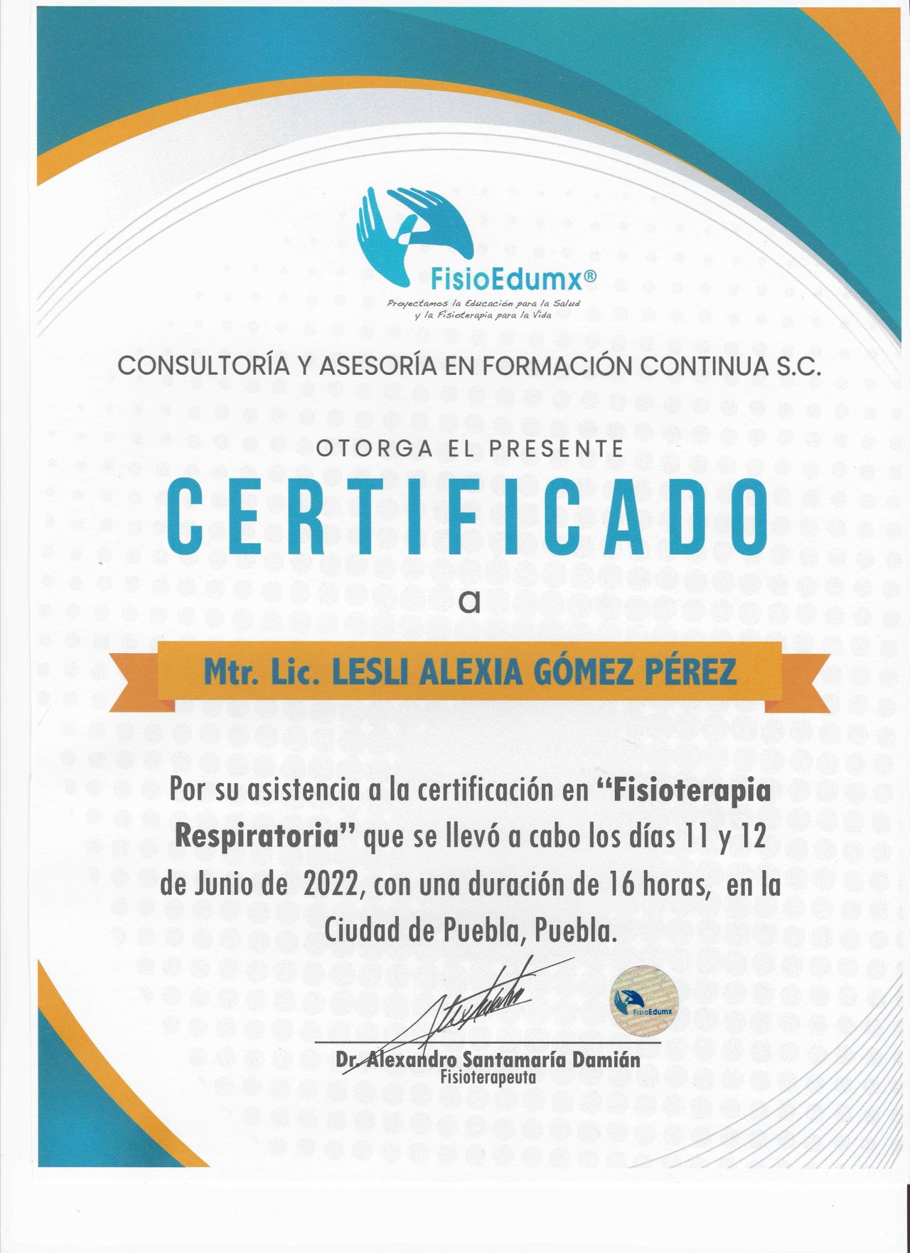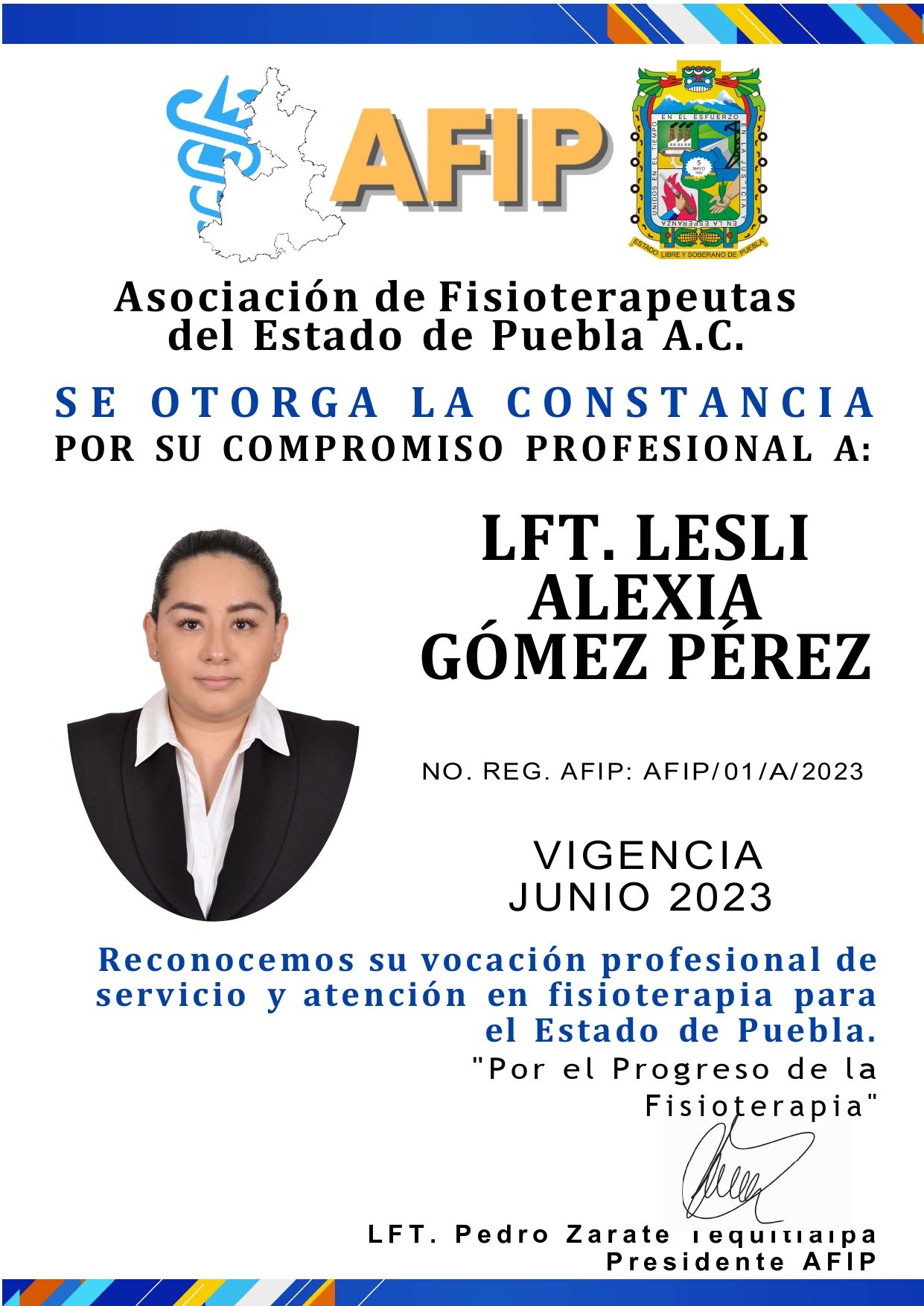 Soy Lesli Alexia Gómez Pérez Fisioterapeuta egresada de la Universidad del Valle de México con más de 8 años de experiencia laboral en diversas instituciones de salud y rehabilitación. Mi compromiso es ser una profesional de la salud dedicada y en constante actualización, con responsabilidad que brinda tratamientos especializados a pacientes adultos mayores, deportivos, neurológicos, que padecen alguna alteración del sistema musculoesquelético, enfermedad o se derive de lesiones y/o envejecimiento; ofreciendo planes de tratamientos individualizados de salud eficaces y de calidad profesional para recuperar su funcionalidad, readaptar y prevenir futuras lesiones; asimismo, aumentar su calidad de vida y eliminar el dolor.
