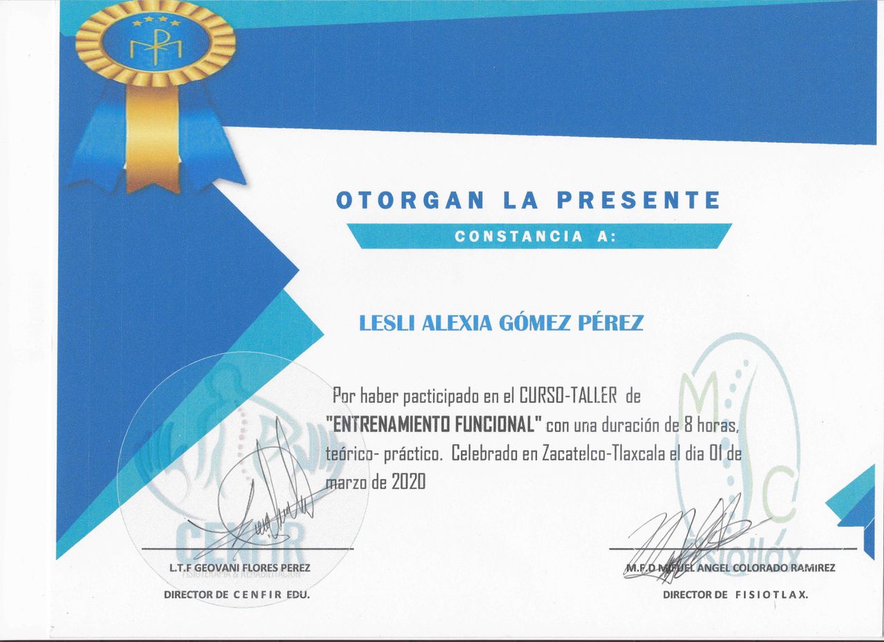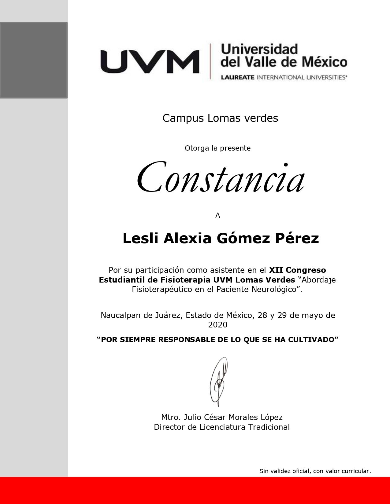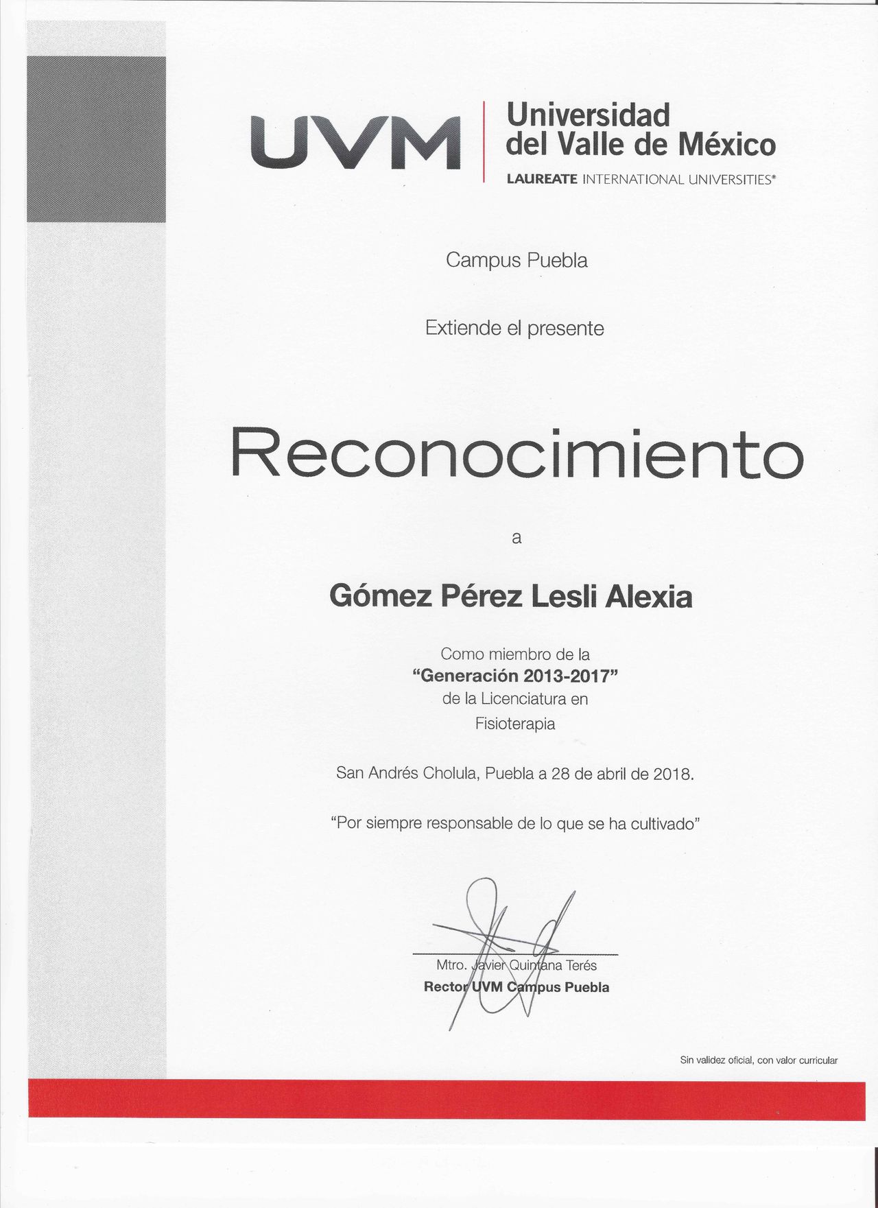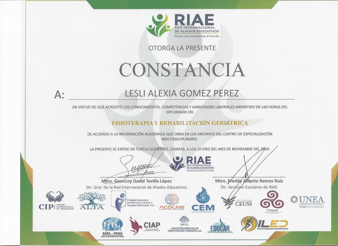 Soy Lesli Alexia Gómez Pérez Fisioterapeuta egresada de la Universidad del Valle de México con más de 8 años de experiencia laboral en diversas instituciones de salud y rehabilitación. Mi compromiso es ser una profesional de la salud dedicada y en constante actualización, con responsabilidad que brinda tratamientos especializados a pacientes adultos mayores, deportivos, neurológicos, que padecen alguna alteración del sistema musculoesquelético, enfermedad o se derive de lesiones y/o envejecimiento; ofreciendo planes de tratamientos individualizados de salud eficaces y de calidad profesional para recuperar su funcionalidad, readaptar y prevenir futuras lesiones; asimismo, aumentar su calidad de vida y eliminar el dolor.