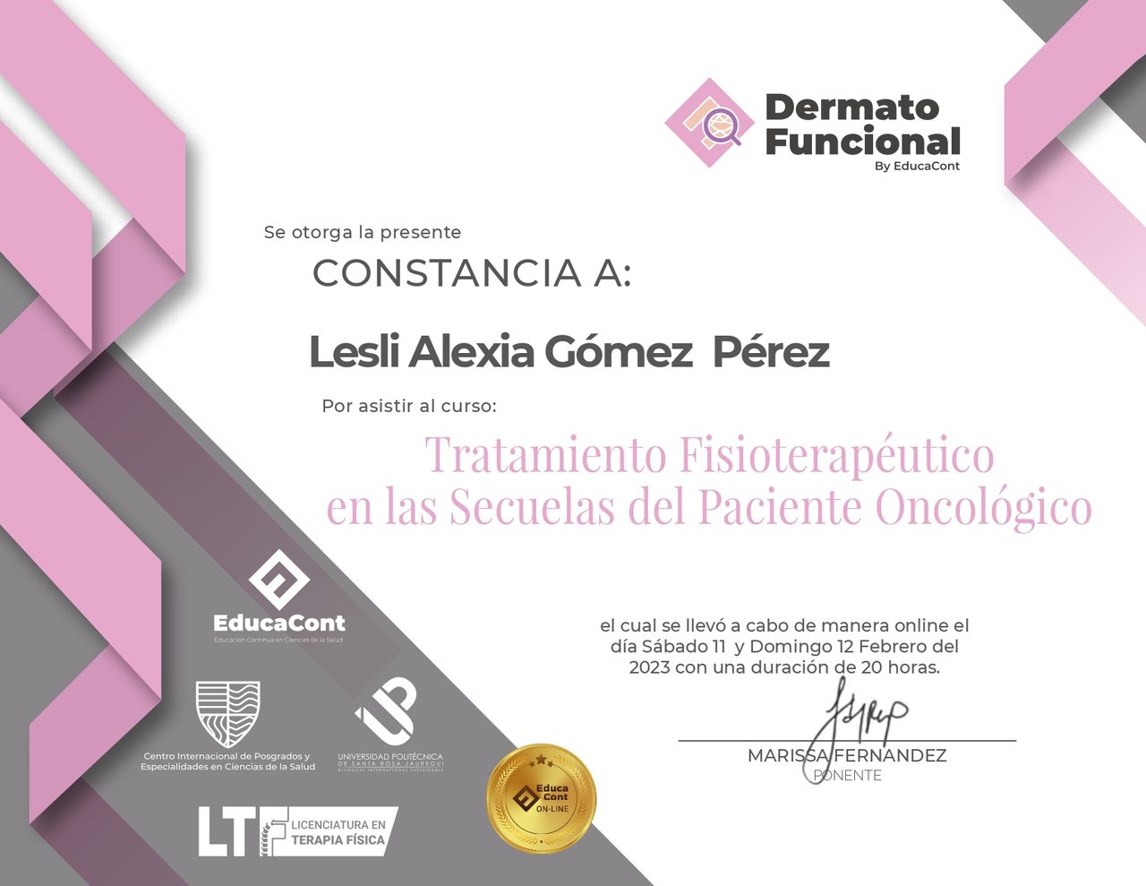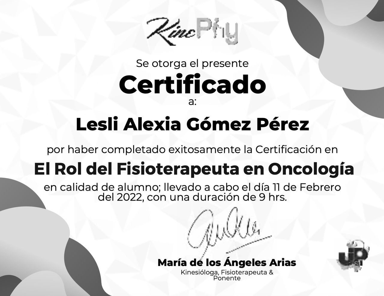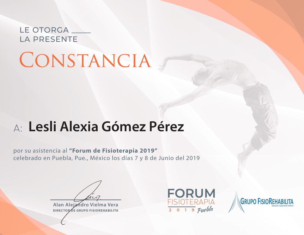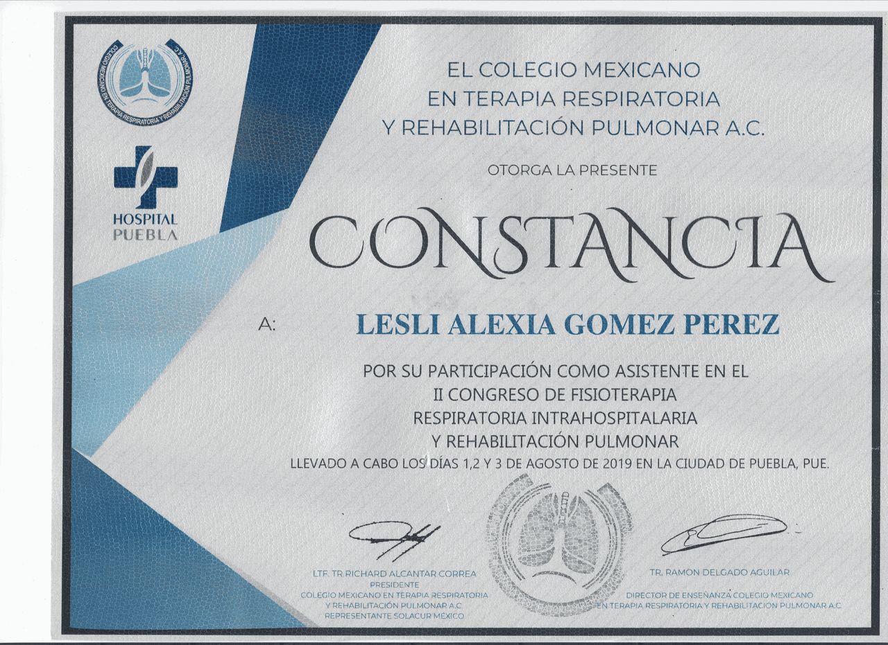 Soy Lesli Alexia Gómez Pérez Fisioterapeuta egresada de la Universidad del Valle de México con más de 8 años de experiencia laboral en diversas instituciones de salud y rehabilitación. Mi compromiso es ser una profesional de la salud dedicada y en constante actualización, con responsabilidad que brinda tratamientos especializados a pacientes adultos mayores, deportivos, neurológicos, que padecen alguna alteración del sistema musculoesquelético, enfermedad o se derive de lesiones y/o envejecimiento; ofreciendo planes de tratamientos individualizados de salud eficaces y de calidad profesional para recuperar su funcionalidad, readaptar y prevenir futuras lesiones; asimismo, aumentar su calidad de vida y eliminar el dolor.