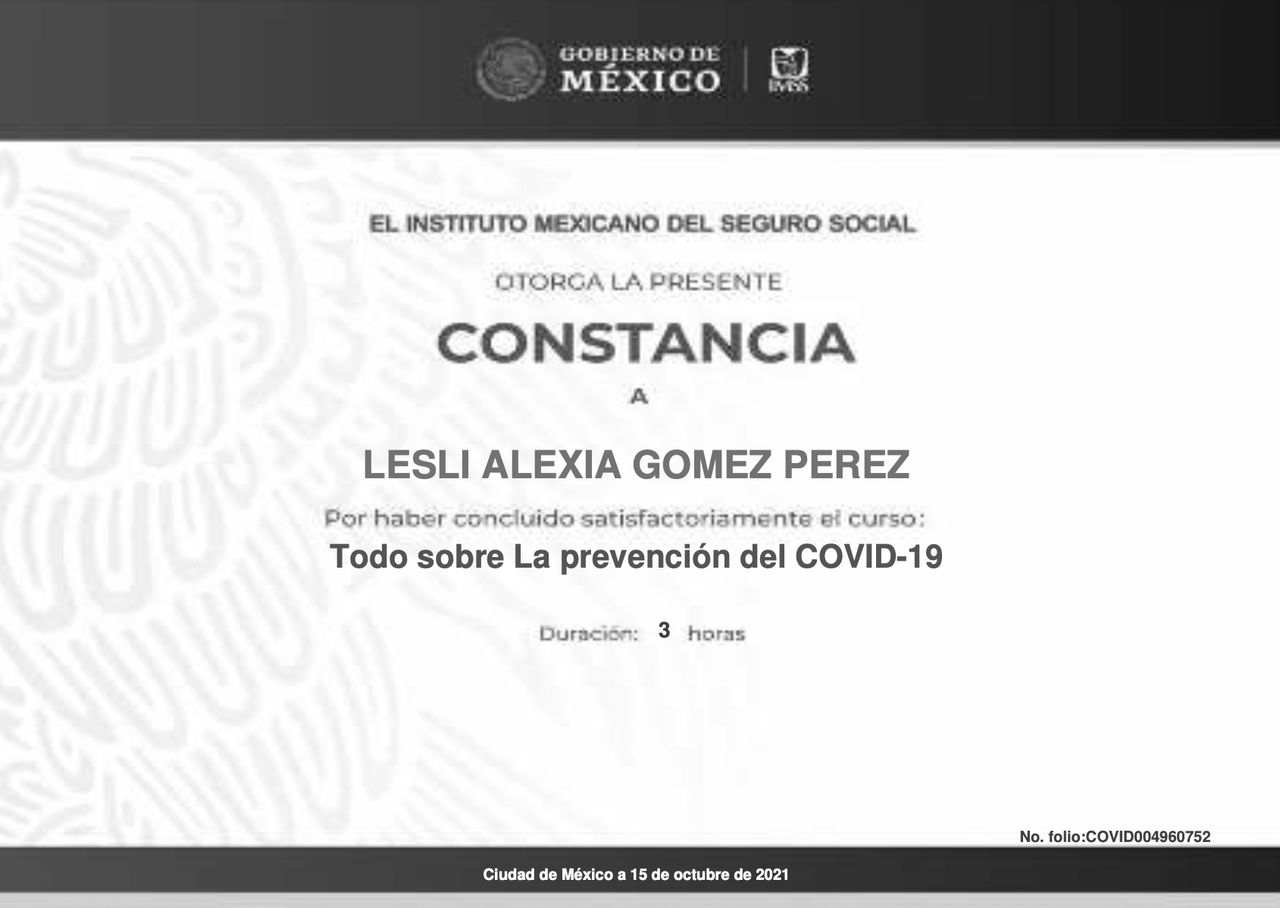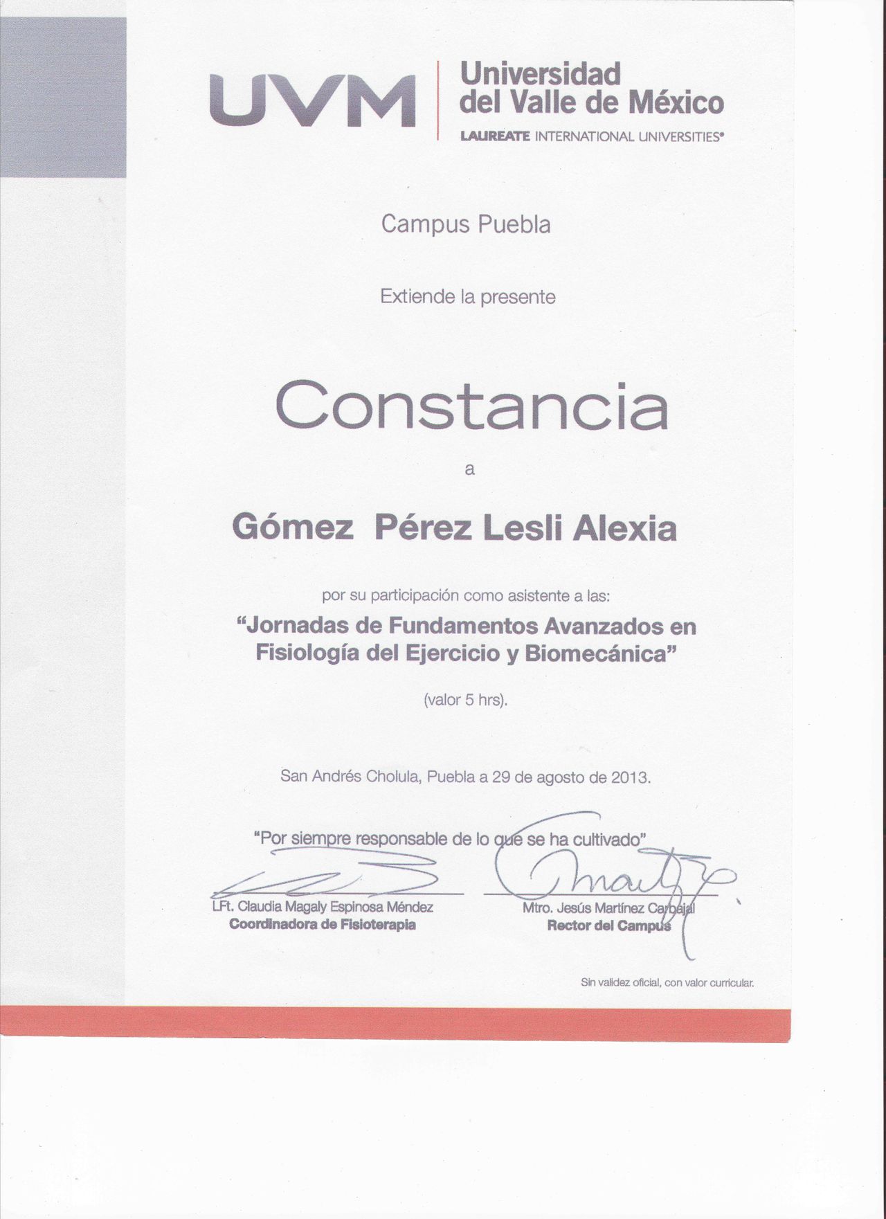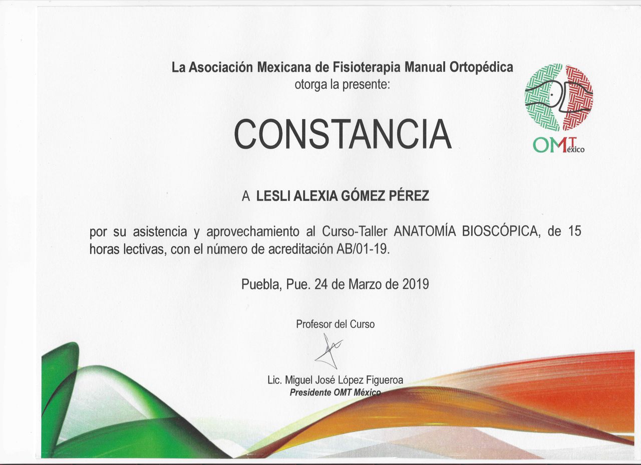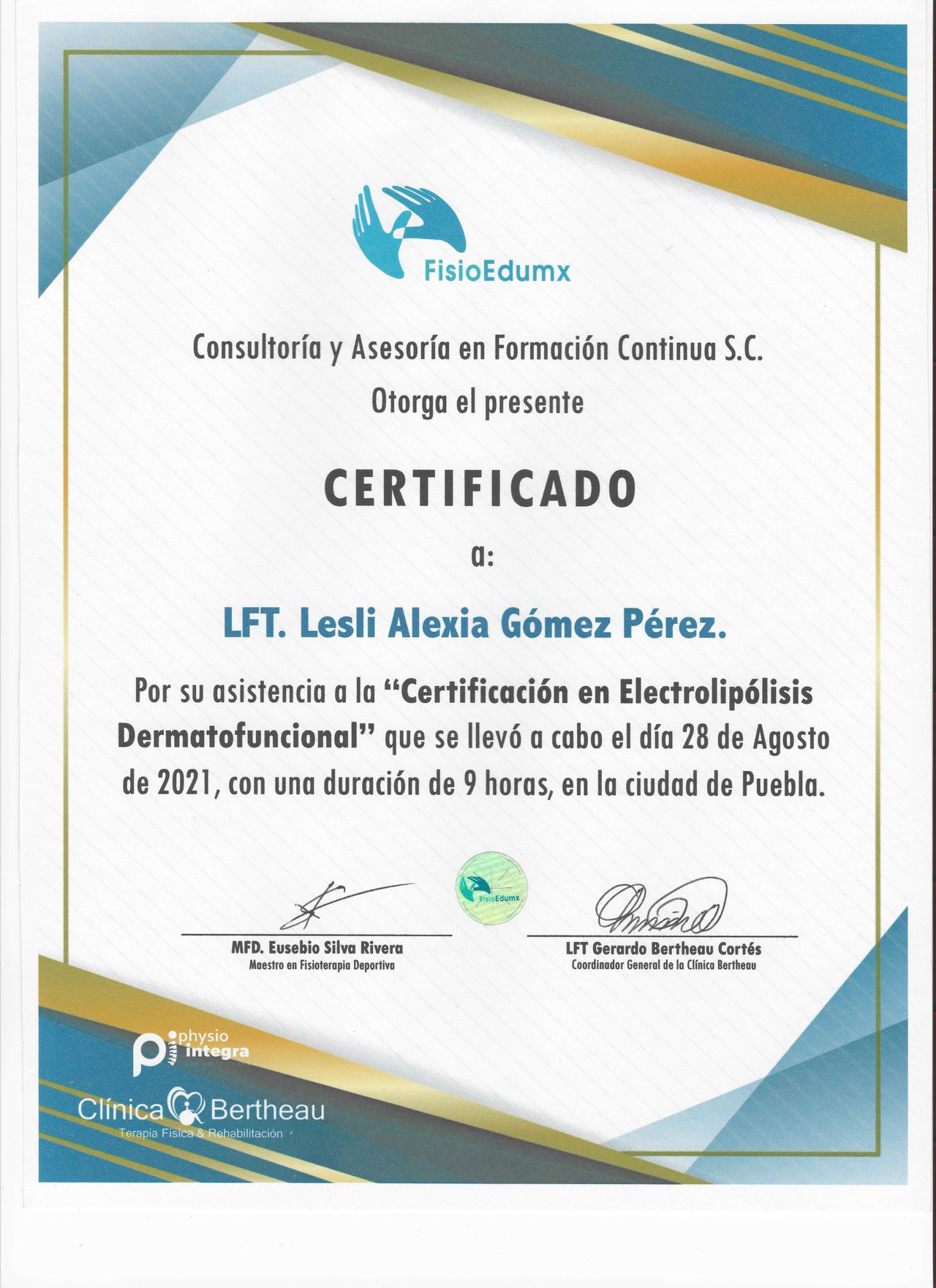 Soy Lesli Alexia Gómez Pérez Fisioterapeuta egresada de la Universidad del Valle de México con más de 8 años de experiencia laboral en diversas instituciones de salud y rehabilitación. Mi compromiso es ser una profesional de la salud dedicada y en constante actualización, con responsabilidad que brinda tratamientos especializados a pacientes adultos mayores, deportivos, neurológicos, que padecen alguna alteración del sistema musculoesquelético, enfermedad o se derive de lesiones y/o envejecimiento; ofreciendo planes de tratamientos individualizados de salud eficaces y de calidad profesional para recuperar su funcionalidad, readaptar y prevenir futuras lesiones; asimismo, aumentar su calidad de vida y eliminar el dolor.