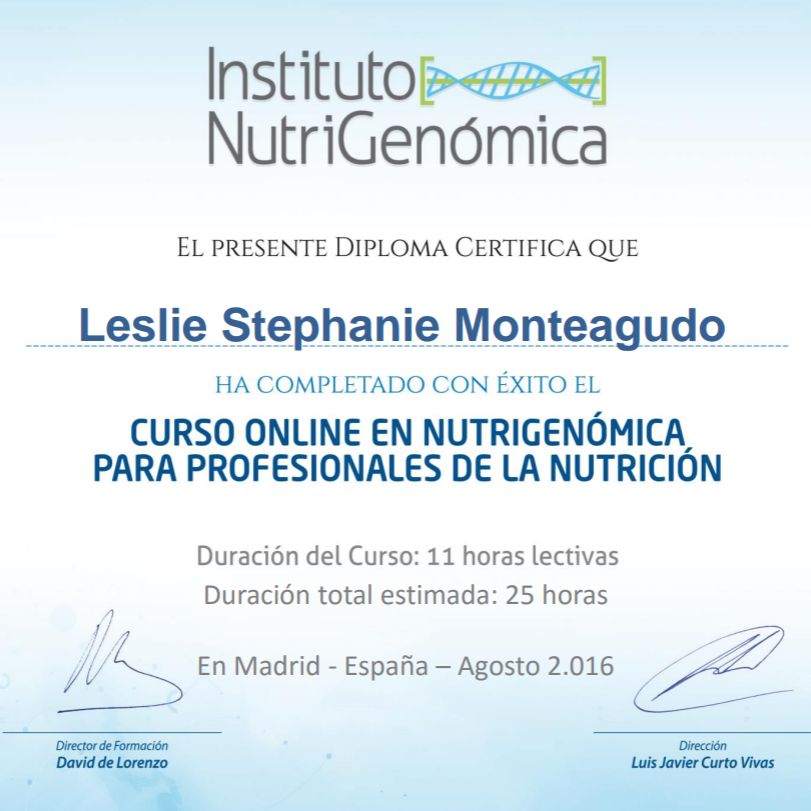 Tengo varias certificaciones dentro de las que se encuentran Nutrición Basada en Plantas por la Universidad de Cornell, Síndrome Metabólico por la ESPEN y Nutrigenómica para profesionales de la nutrición por el Instituto de Nutrigenómica en Madrid.