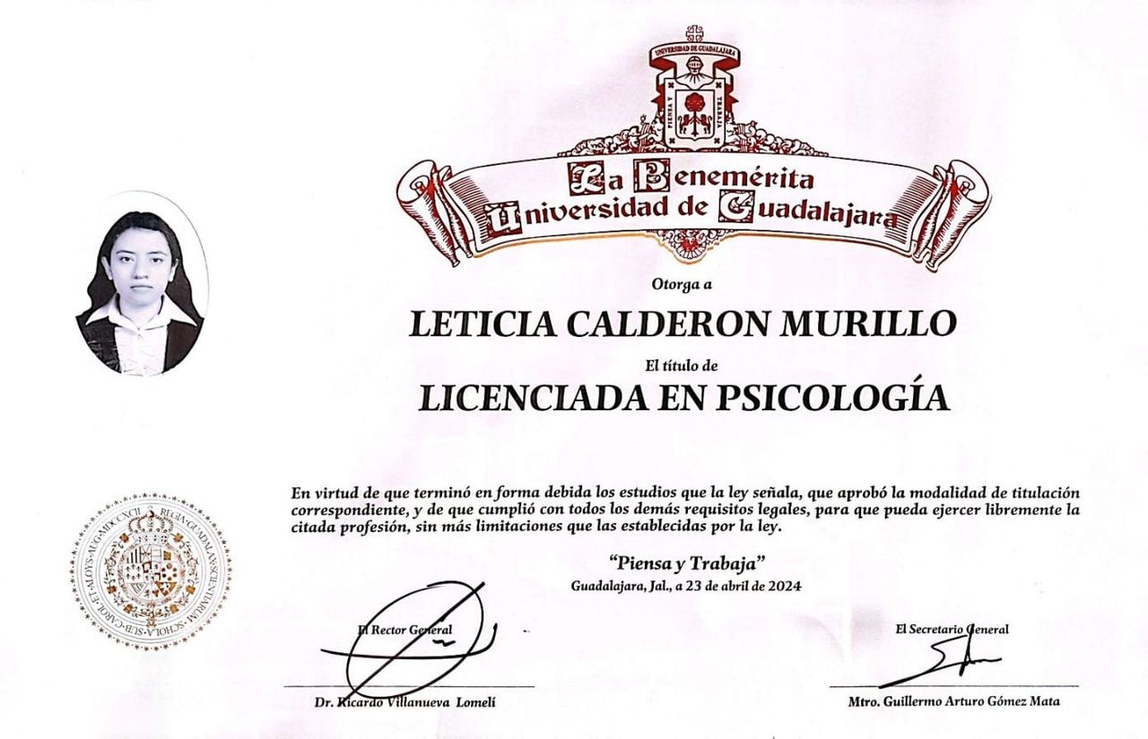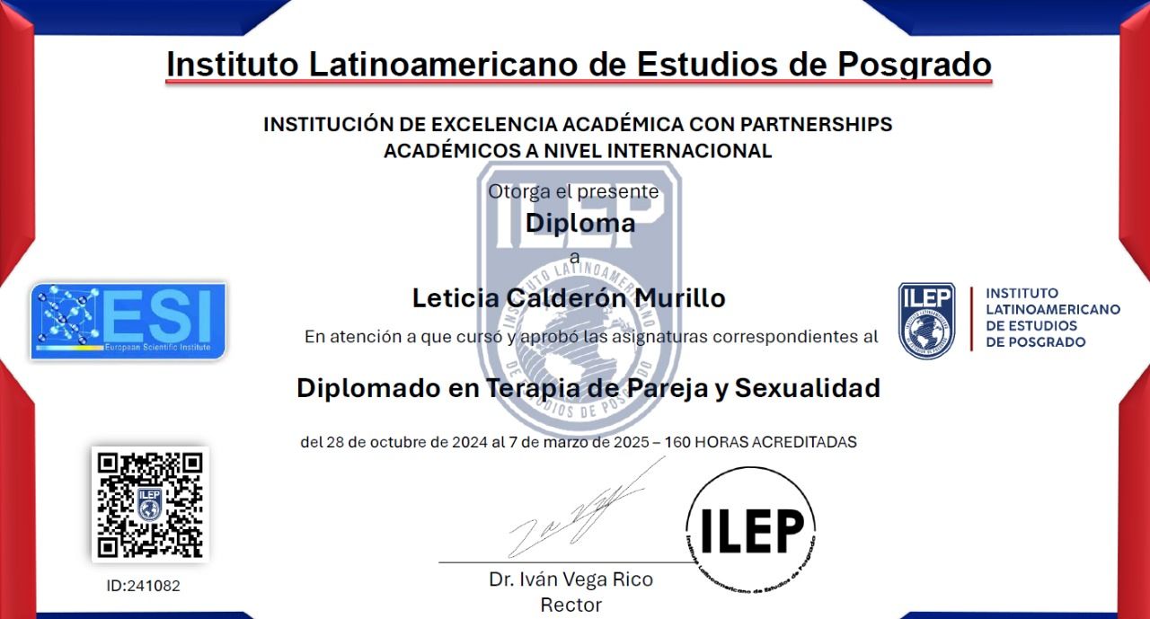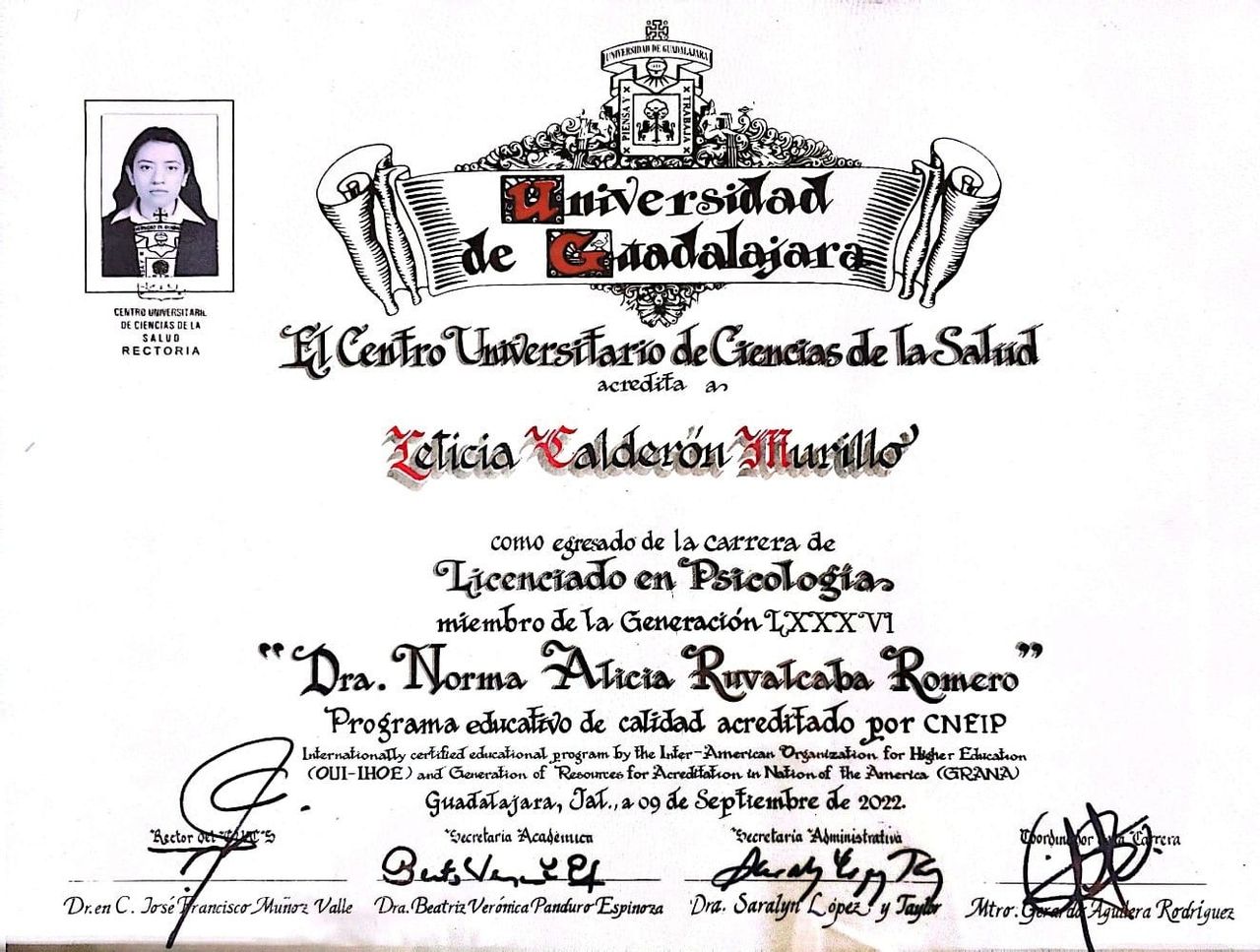 Soy psicóloga egresada de la Universidad de Guadalajara, con diplomados en Terapia de Pareja y Sexualidad, así como en Terapia Familiar Sistémica, avalados por el Instituto Latinoamericano de Estudios de Posgrado.