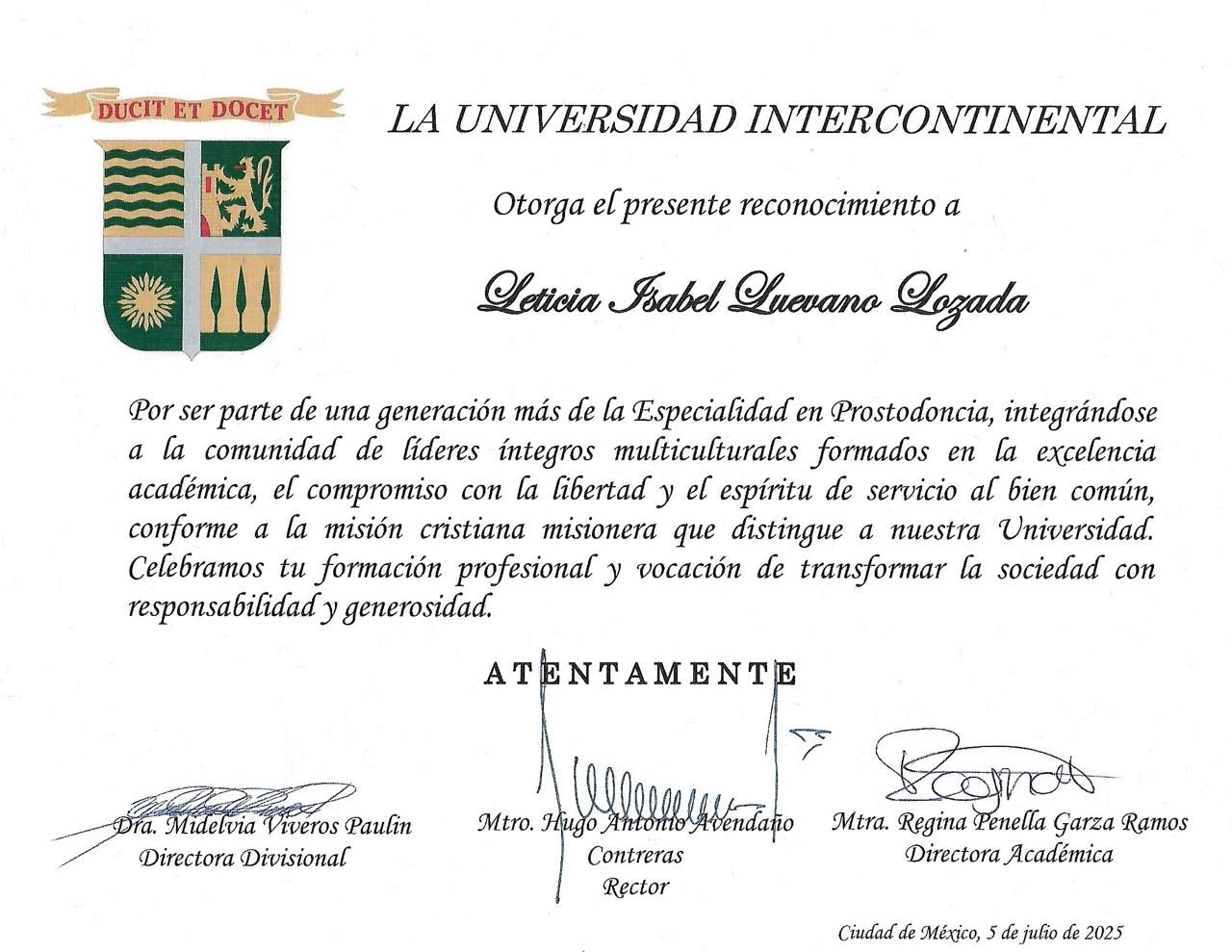 ¡Hola! Soy la doctora Leticia Luevano, Cirujano dentista por la Universidad Latinoamericana y especialista en Prostodoncia por parte de la Universidad Intercontinental. Tengo experiencia clínica de más de 4 años enfocada en odontología estética y rehabilitación oral. Mi objetivo es ayudarte a recuperar la confianza en tu sonrisa, no solo desde lo estético, sino también desde la función, para que puedas volver a hablar, comer y sonreír con comodidad y confianza.