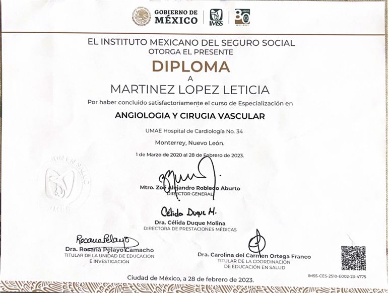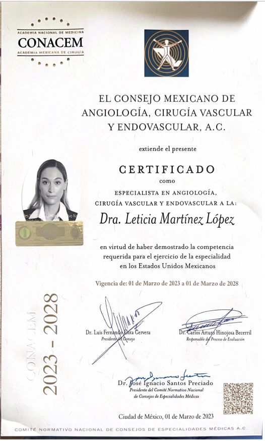 Angióloga, cirujana vascular y endovascular certificada por el Consejo Mexicano de Angiología
