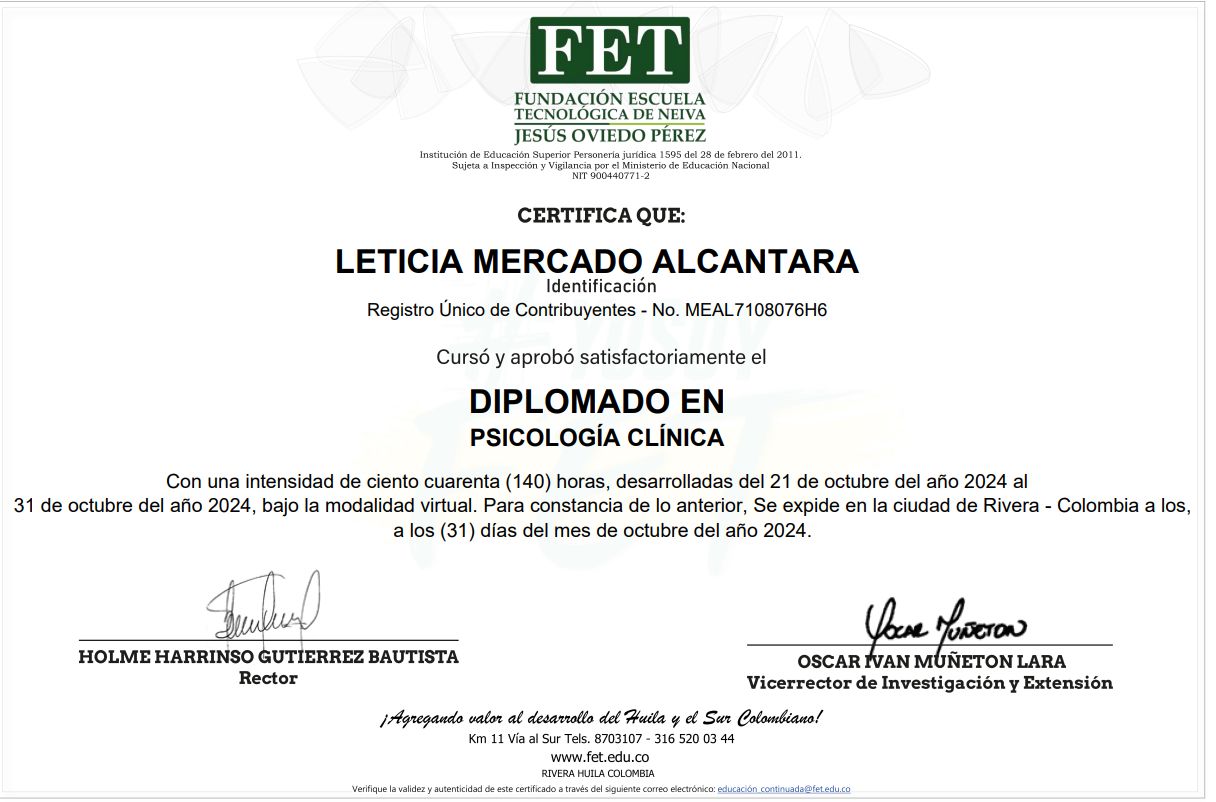 Recomiendo ampliamente a la Psicóloga Leticia Mercado. Es puntual, y da un muy buen seguimiento. Sus explicaciones son claras y detalladas. A lo largo de mi tratamiento, me ha proporcionado herramientas para mejorar mi salud. Por esto, la recomiendo como terapeuta y profesional de la salud.