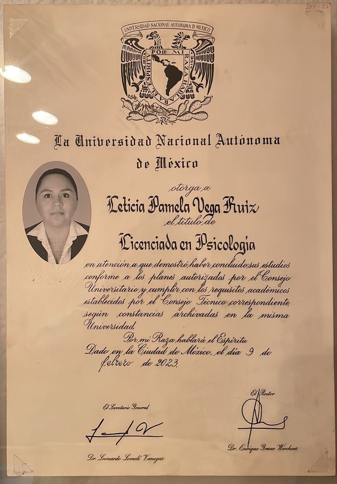 Egresé como licenciada de la Facultad de Psicología en Ciudad Universitaria de la UNAM y actualmente egresé de la maestria en el centro de Psicoterapia Cognitivo Conductual.