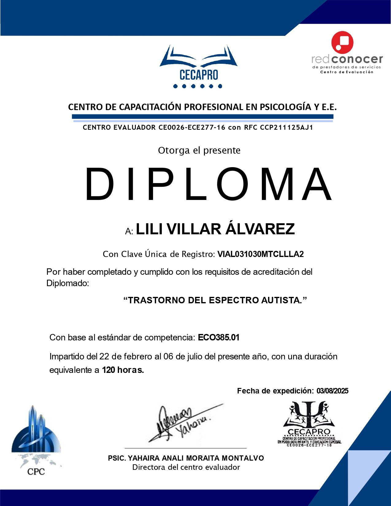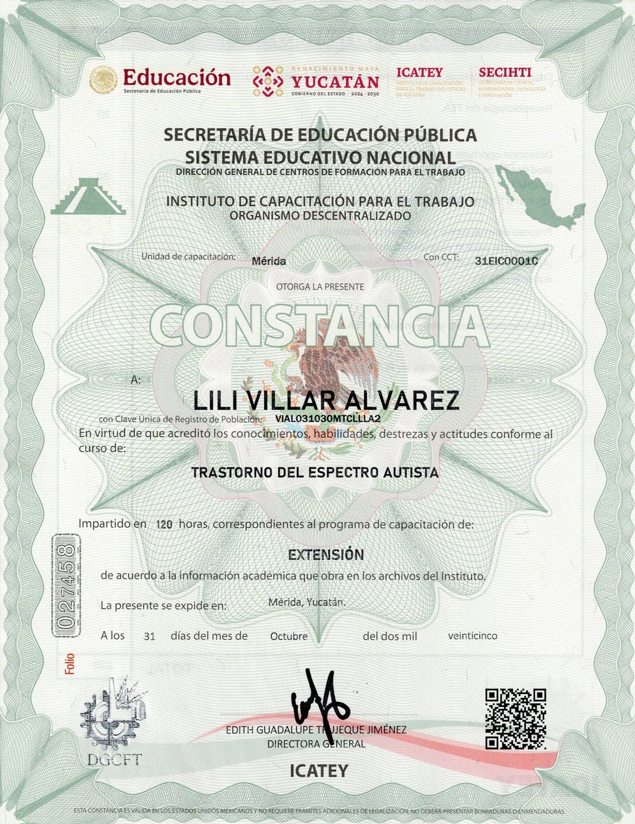 Diplomado en "Trastorno del Espectro Autista" en el Centro de Capacitación Profesional en Psicología Infantil y E.E Cecapro, avalado por la SEP y el Instituto de Capacitación para el Trabajo del Estado de Yucatán (ICATEY).