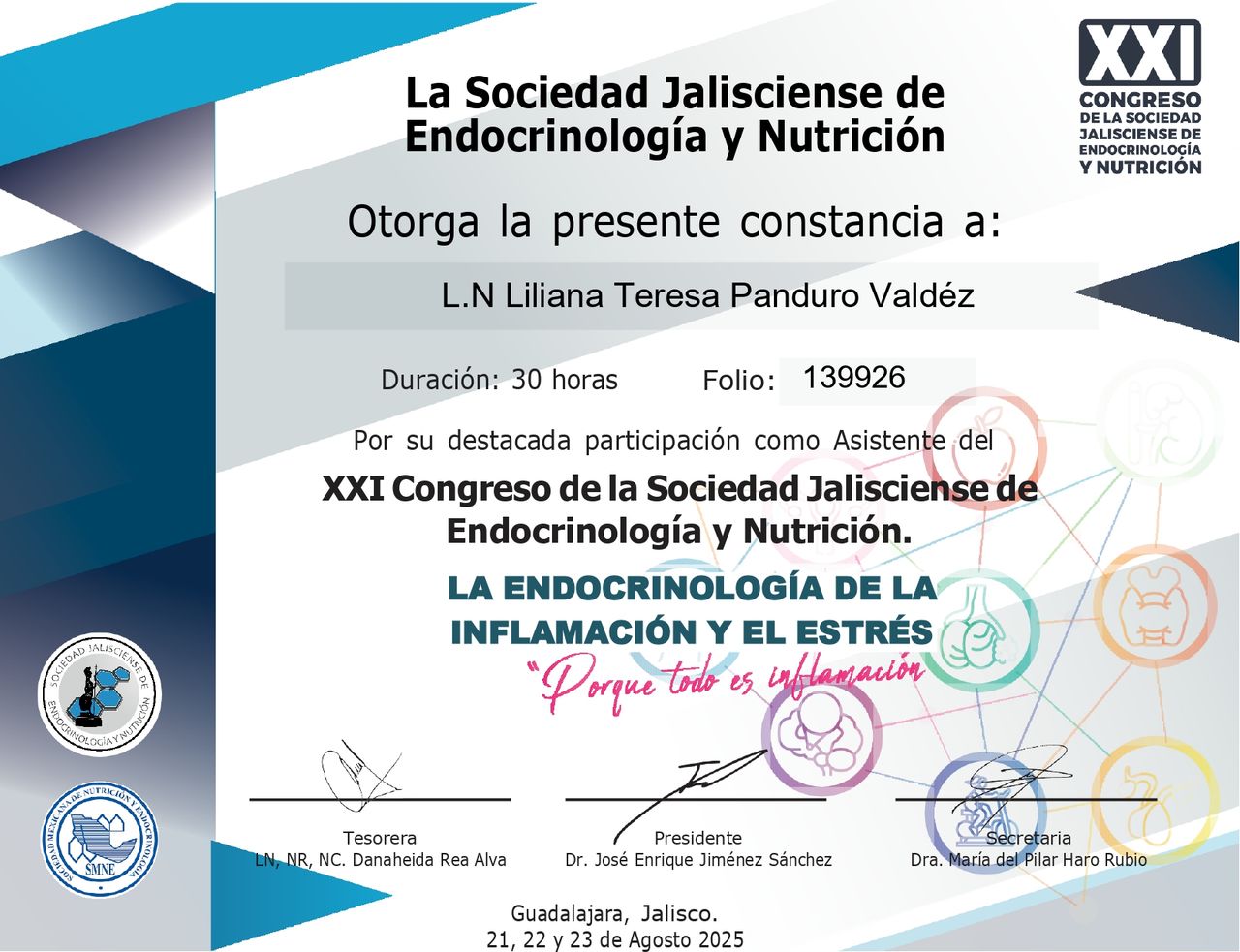 Mi enfoque es ayudarte a mejorar tu salud con planes prácticos, claros y adaptados a tu estilo de vida. Me mantengo actualizada como miembro activo del Colegio de Nutriólogos de Jalisco y del Colegio de Nutriólogos Renales, para brindarte atención basada en la evidencia más reciente.