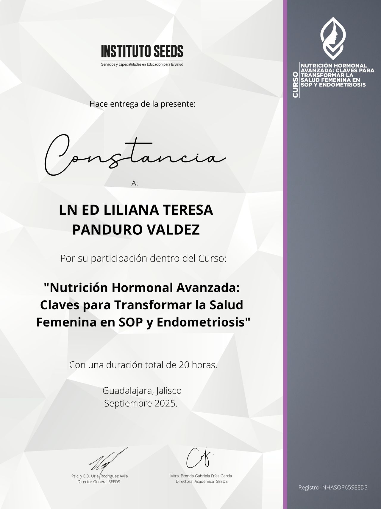Soy Liliana Teresa Panduro Valdez, educadora en diabetes y nutricionista certificada. Cuento con 10 años de experiencia y me he especializado en consultas personalizadas para el manejo de la diabetes y la salud renal durante los últimos 3 años.