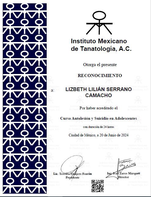 Complementé mi formación con diplomados en el Instituto Mexicano de Tanatología en Tanatología, Apoyo y Acompañamiento Tanatológico, Logoterapia, Cuidados Paliativos, Geriatría y Gerontología, lo que me permite acompañar procesos complejos con herramientas que priorizan la contención, el respeto y el sentido.