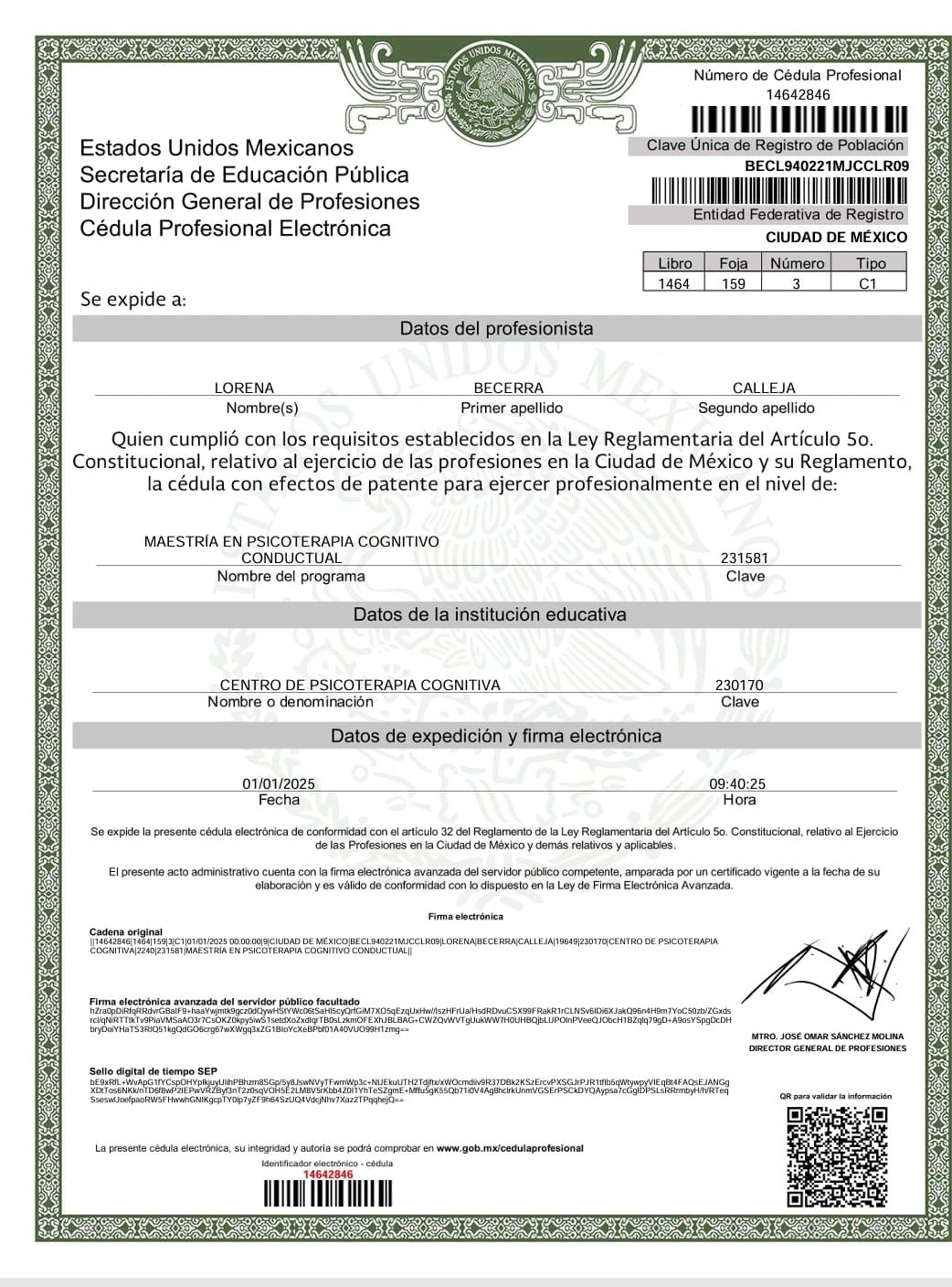 A lo largo de mis sesiones con lorena he sentido un acompañamiento empático, paciente y real, me ha ayudado a entender mis emociones sin juzgarlas, a trabajar mi relación conmigo misma y con los demás, y a poner en palabras cosas que antes solo sentía como un caos, todo aquello que me perturbaba con las herramientas que me da se me facilita más sobrellevar mis fobias etc.. si a alguien debo darle el mérito de mi madurez emocional es a Lorena, profesional, amable y siempre siempre siempre dispuesta a ayudarte, de verdad la recomiendo no van a perder el tiempo, te brinda todo lo necesario para un crecimiento emocional.
