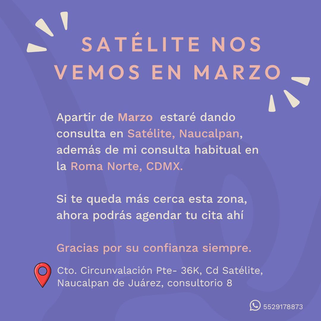 A partir del mes de Marzo me encontraré dando consulta martes y jueves en Satélite.