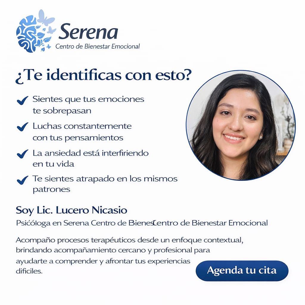 ¡Hola! Soy la Licenciada Lucero Nicasio, psicóloga enfocada en acompañar a personas que atraviesan momentos de ansiedad, depresión, estrés y dificultades para regular sus emociones.
