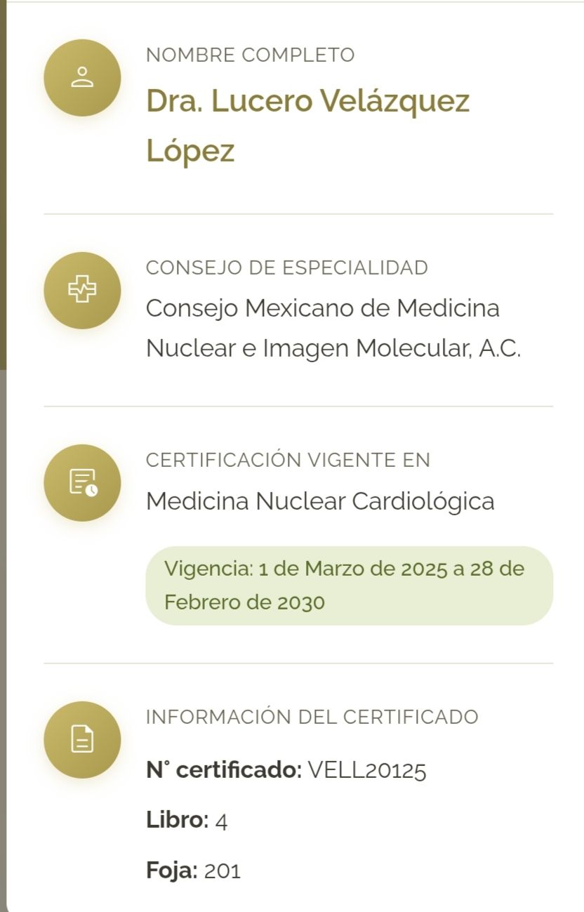 Mi formación incluye Alta especialidad en Cardiología Nuclear y Alta especialidad en PET/CT y angitomografía cardíaca y coronaria, avaladas por la UNAM, con certificación vigente por los consejos Mexicanos de Cardiología y Medicina Nuclear.