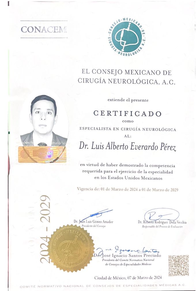 Soy el Dr. Luis Everardo Pérez, neurocirujano con subespecialidad en neurocirugía funcional y estereotaxia. Me especializo en el tratamiento quirúrgico de trastornos del movimiento como la enfermedad de Parkinson, temblor esencial, distonía, dolor neuropático y epilepsia refractaria.